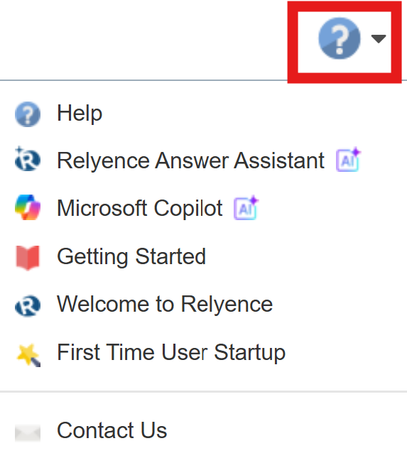 The Relyence online Help guide can be accessed at any time by clicking on the question mark icon in the top right corner of Relyence.