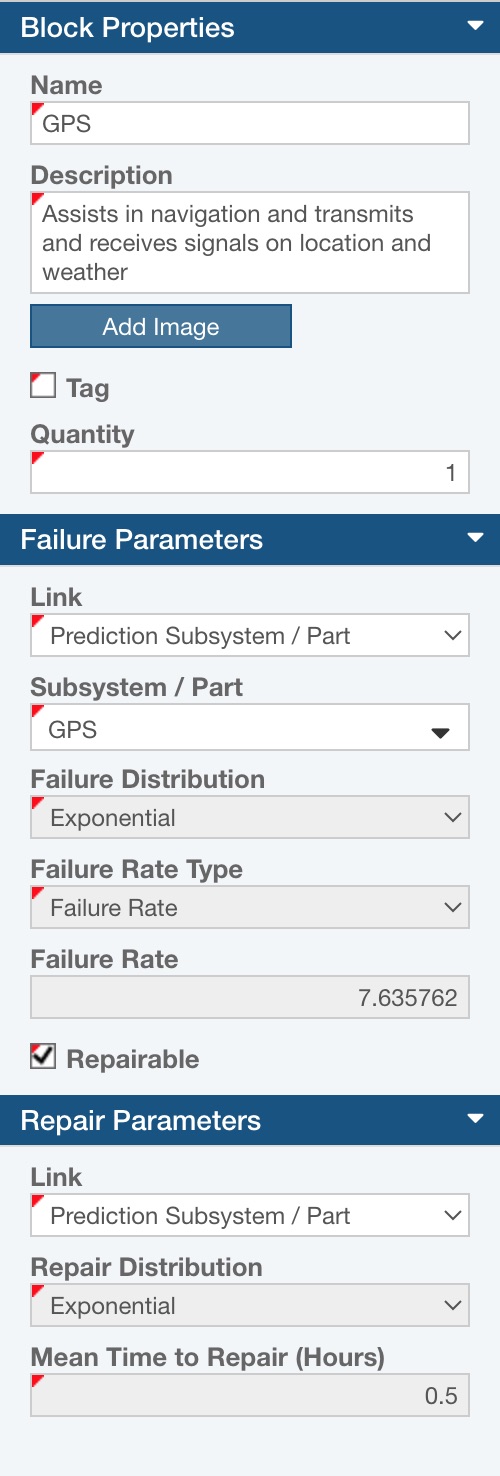 Failure Distribution and associated parameters: If unlinked, you must enter the failure characteristics of the block. The failure parameters consist of the Failure Distribution and the corresponding distribution parameters. For more information about the failure distributions and the associated parameters, refer to the Failure and Repair Distributions topic. For blocks linked to items from a Reliability Prediction analysis or Weibull Life Data Set, these fields will be disabled because the data is retrieved from your prediction or weibull data.