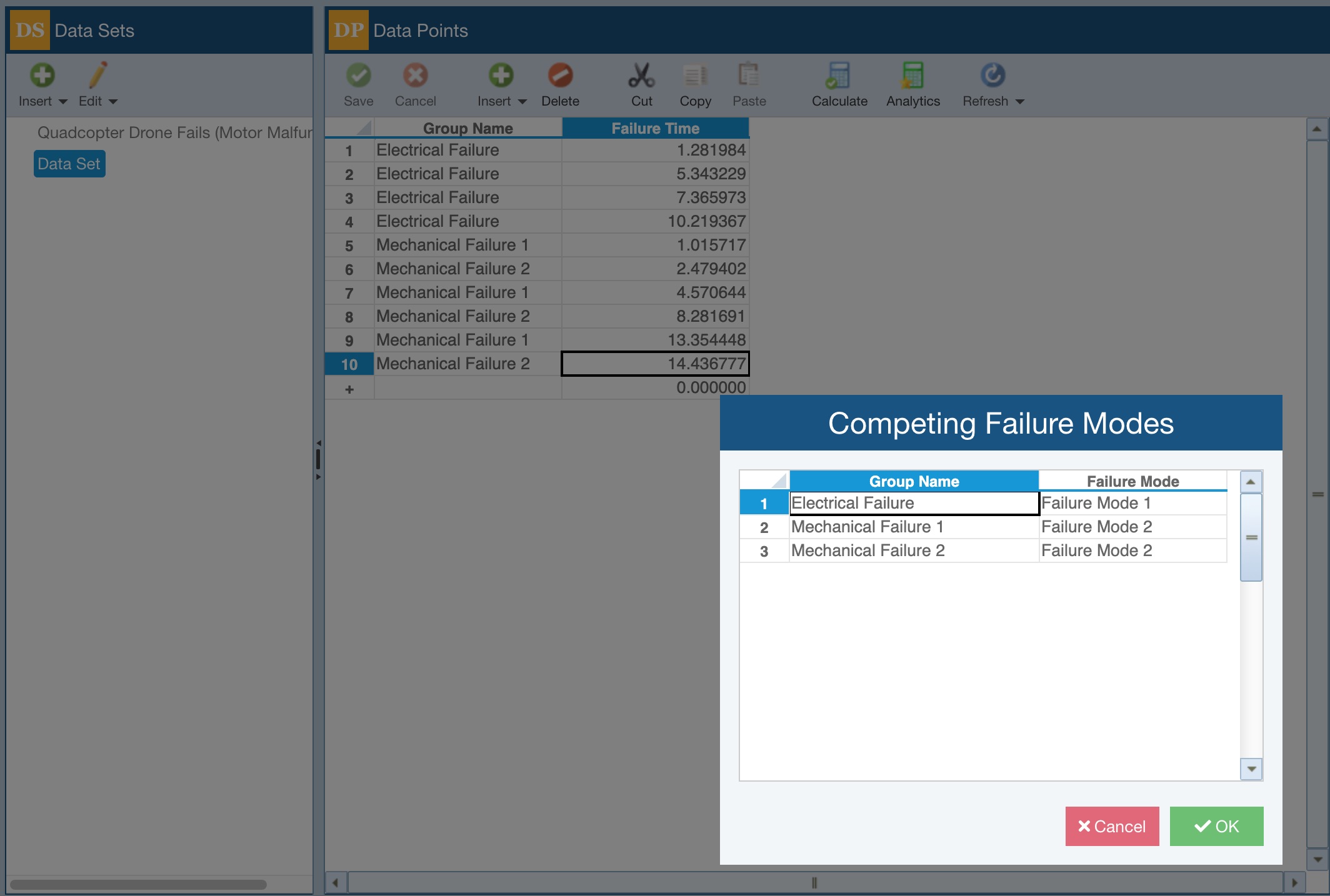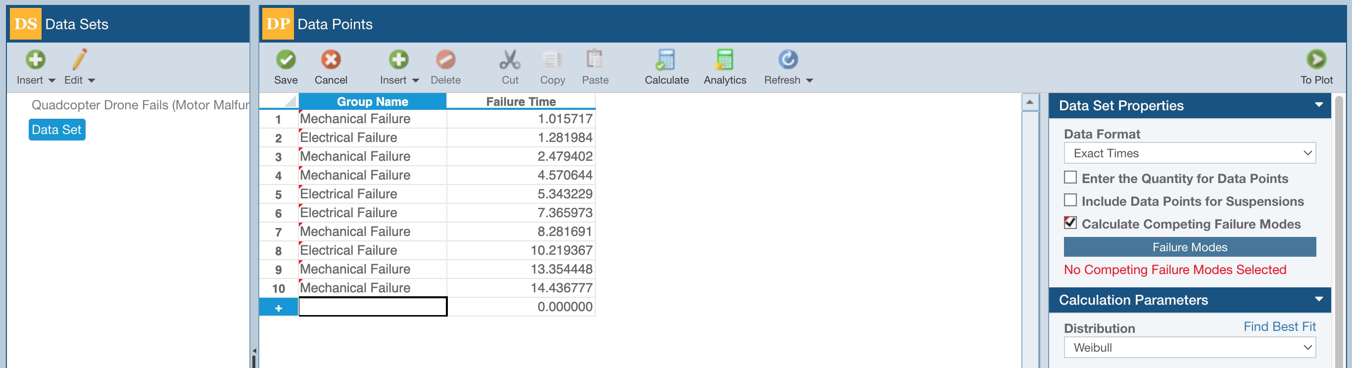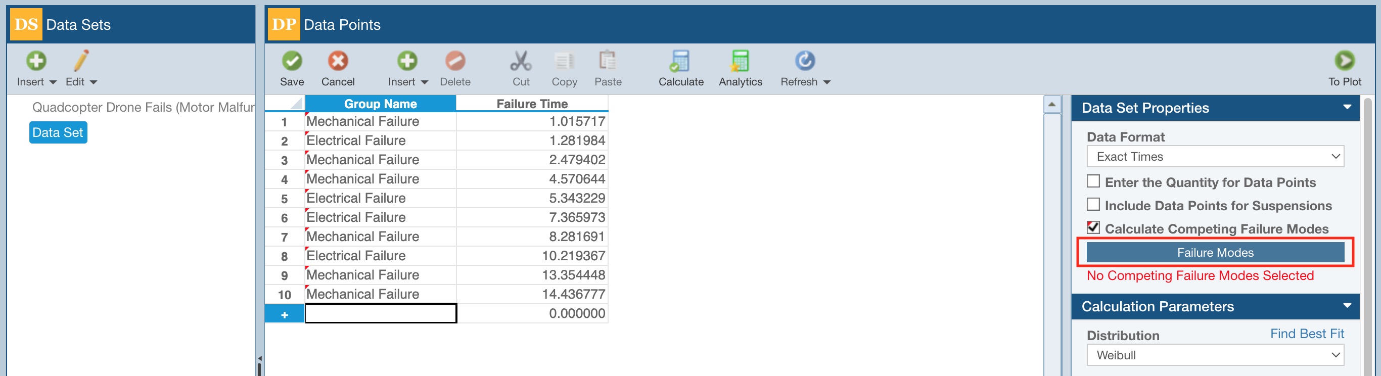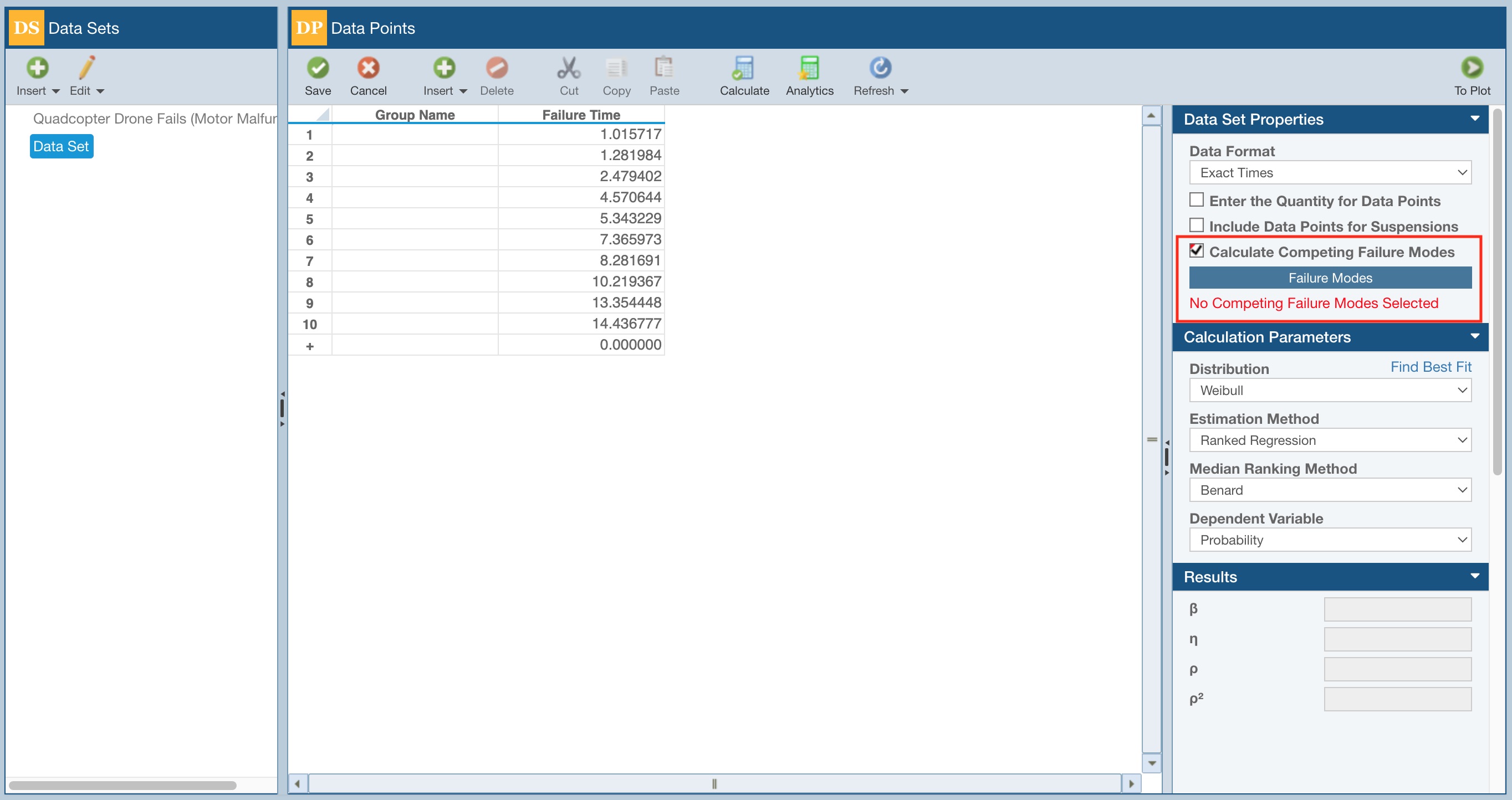 Enter the Life Data in the Data Points table (the sample data below was entered using Tools>Generate Data Points from the Sidebar) and in the Data Set Properties, select Calculate Competing Failure Modes.