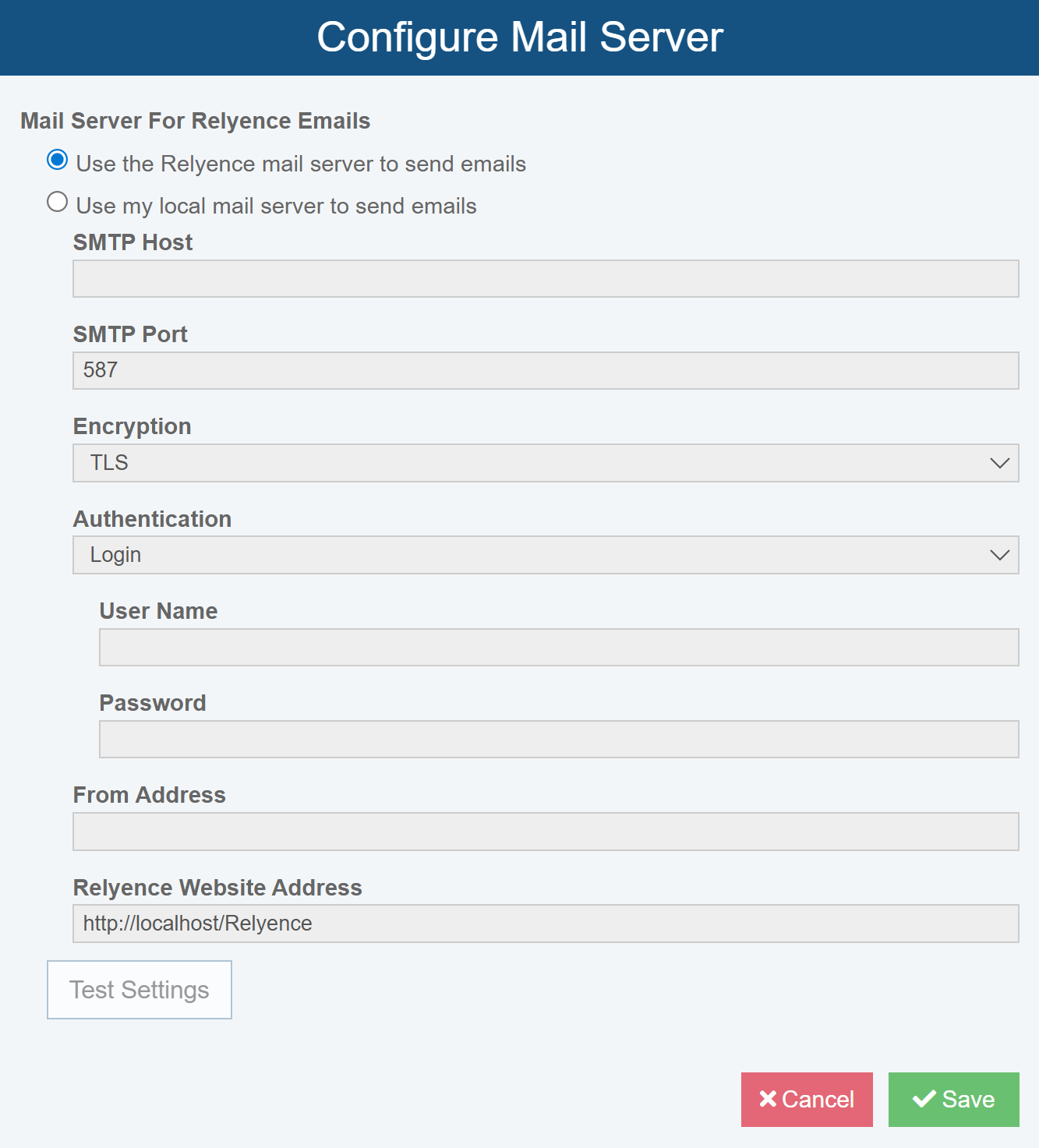 If you prefer to use the Relyence mail server to send emails, select Use the Relyence mail server to send emails and click Save.