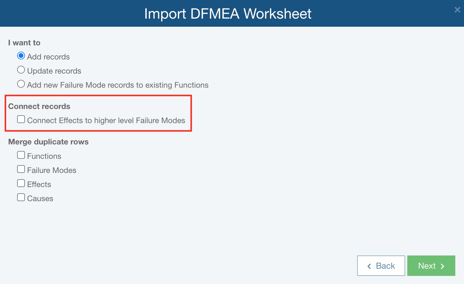 When importing DFMEA data, you have the option to Connect records, which means Effect records and be connected to higher level Failure Mode records during the import process.