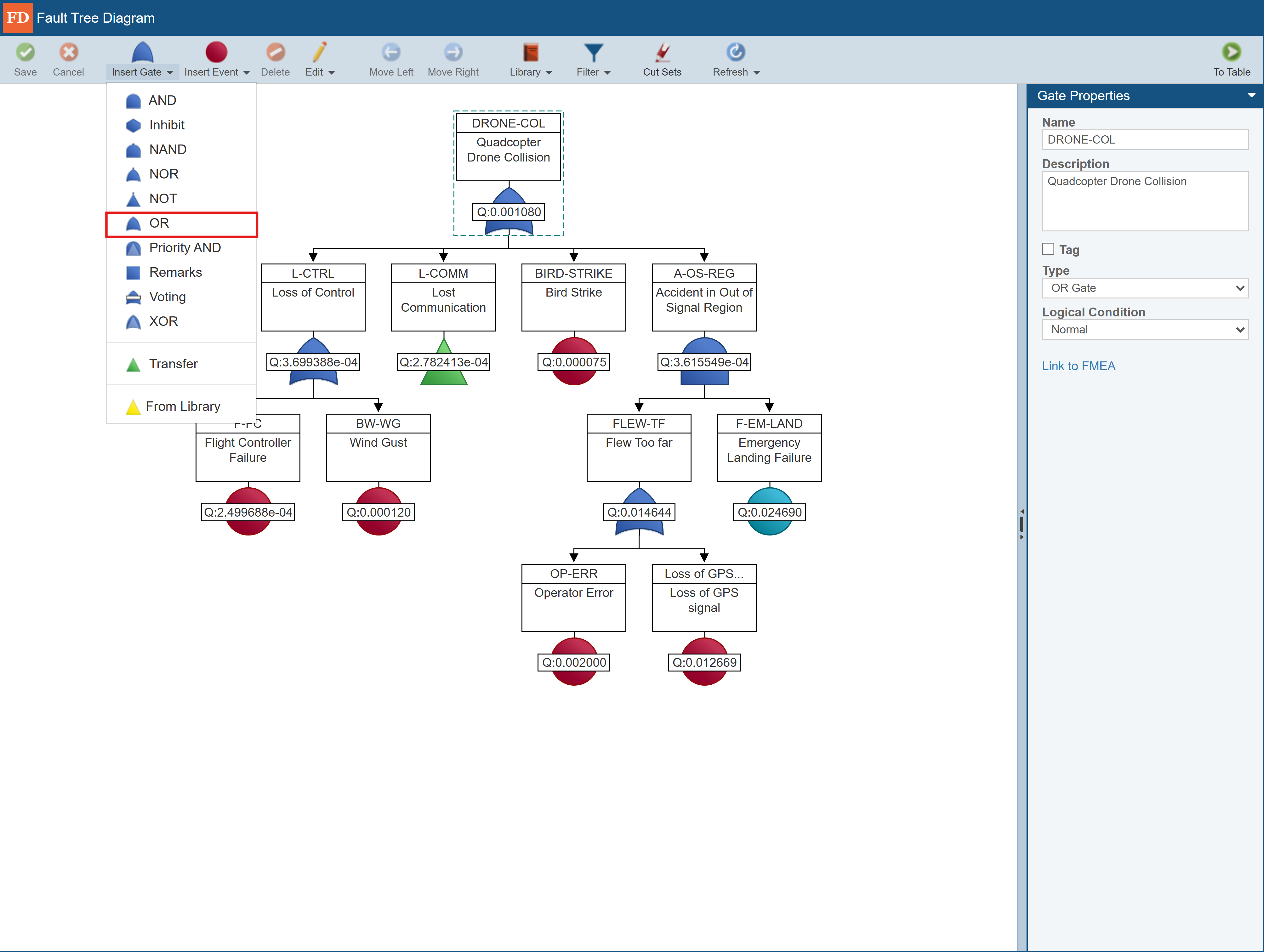 To insert a gate, from the toolbar, click the dropdown arrow next to Insert Gate. You will see the list of all possible gate types. To insert an OR gate, for example, click OR. The new gate will be automatically inserted and aligned below the currently selected item in your fault tree diagram.