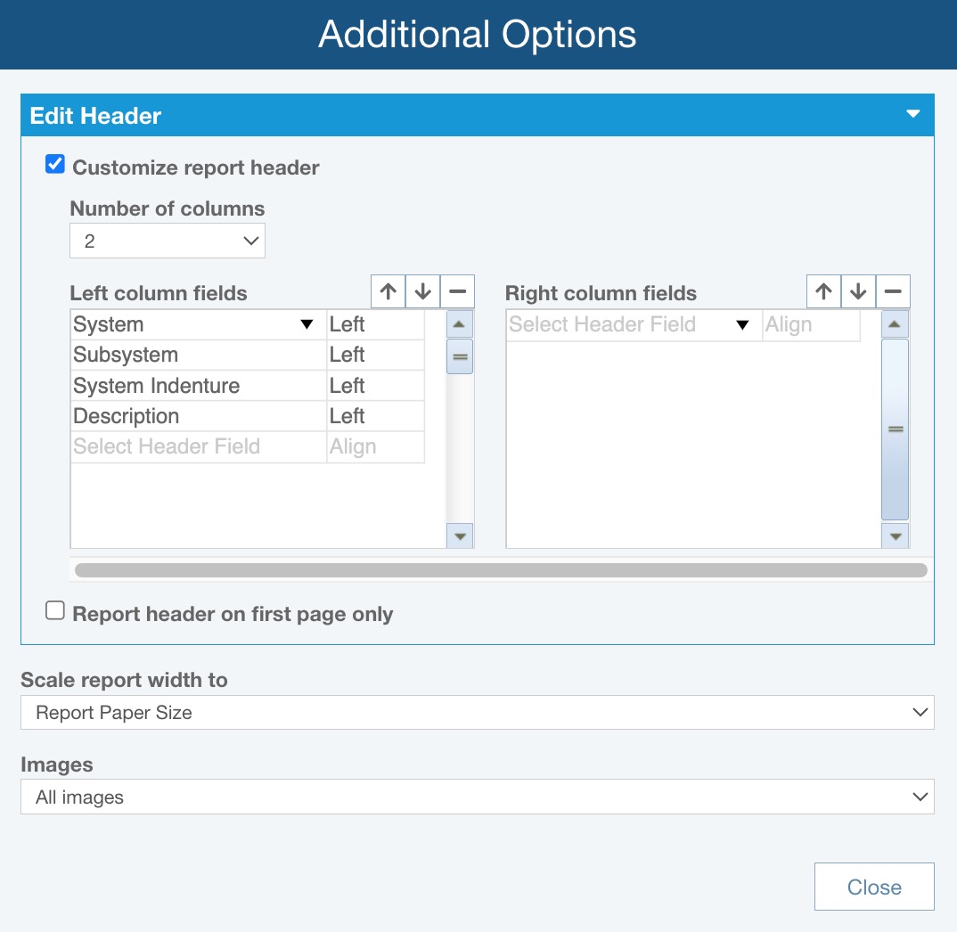 In the Edit Header section, you can identify which fields should appear in 1, 2 or 3 columns of your report header.