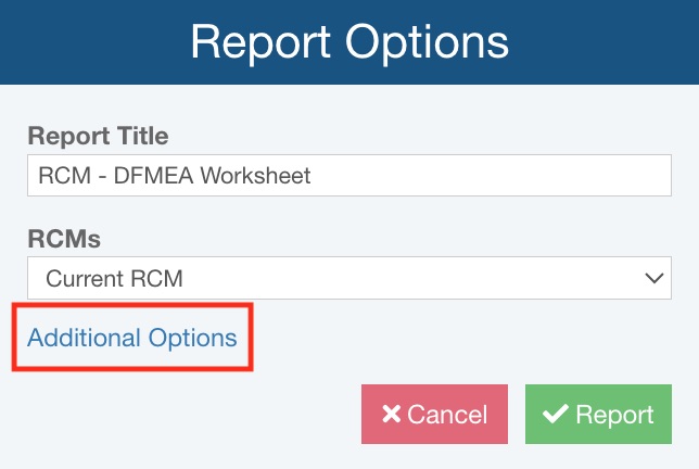 To customize your RCM Worksheet reports, click Report from the Sidebar menu when the RCM Worksheet is active to bring up the Report Options dialog.