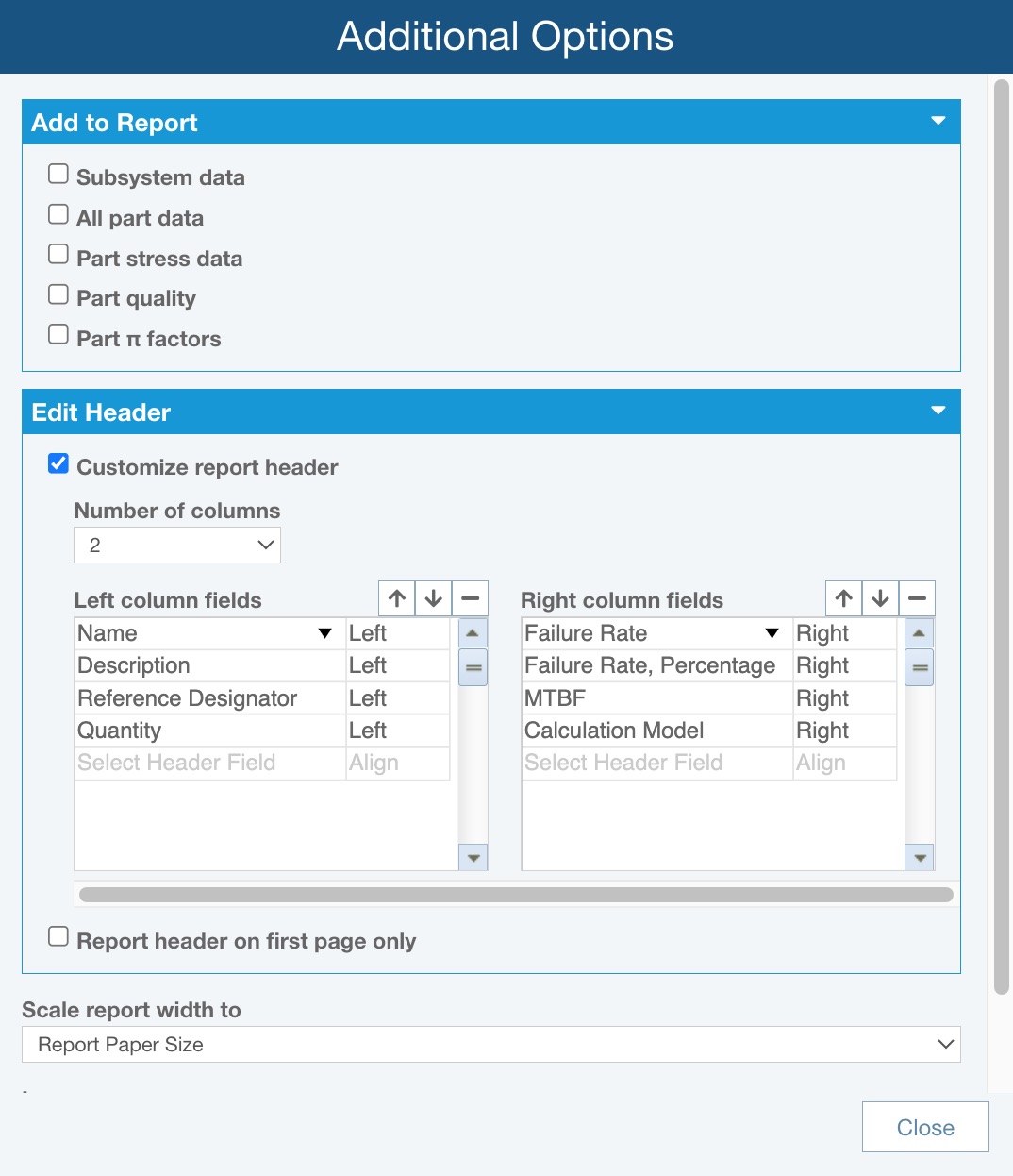 You can customize the report headers in your Reliability Prediction reports. Your report header configuration will be saved, so you only need to specify your customization one time and it will be used each time you run the report.