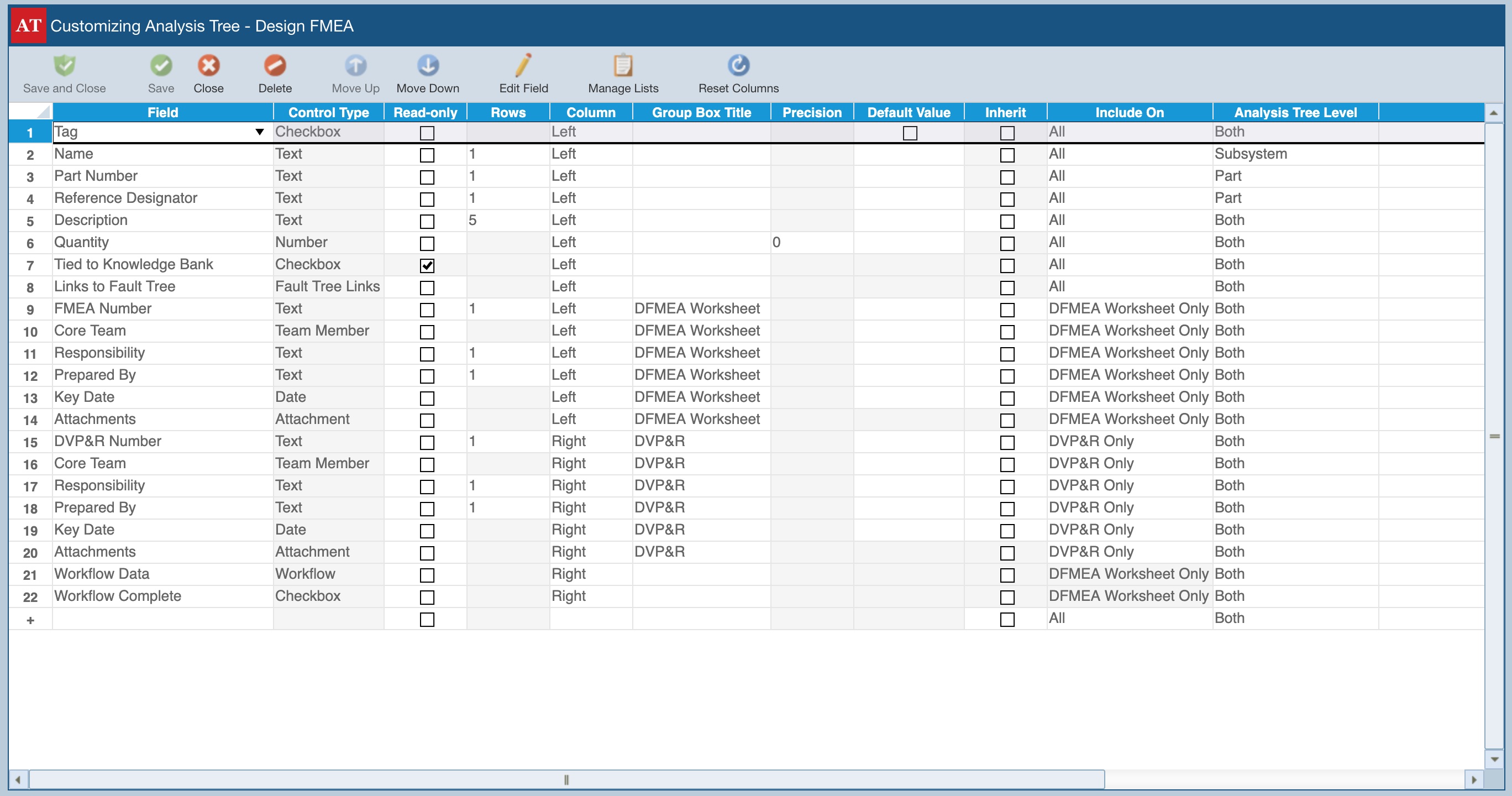 Analysis Tree Level: For Piece-Part DFMEAs, FMEA-MSRs, FMECAs, and Maintainability Predictions, you can also set whether a field should appear on the Properties Forms for Subsystems, Parts, or Both.