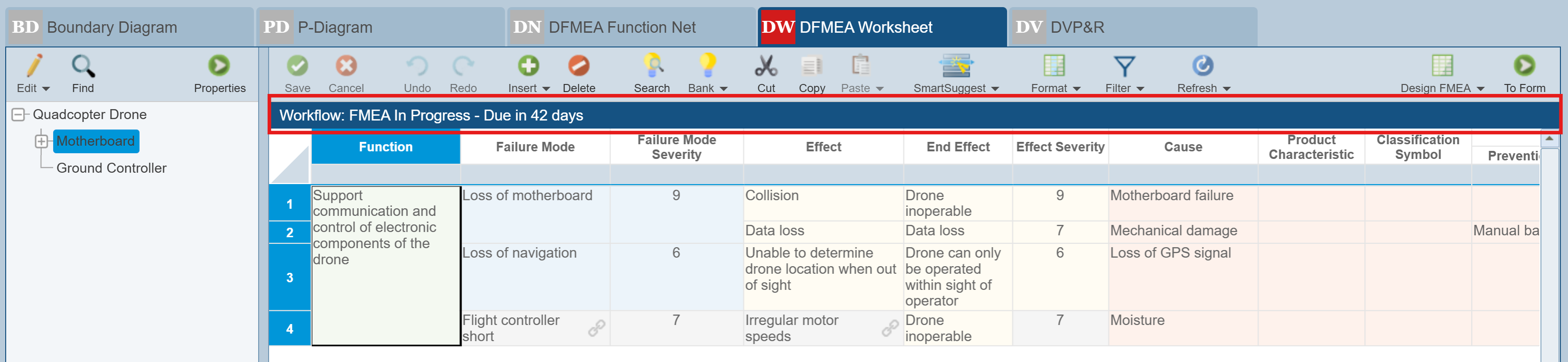 Once your FMEA Workflow is defined, set up for Subsystems and Parts, and added to your Analysis Tree form, you can use the Workflow as part of your FMEA process.