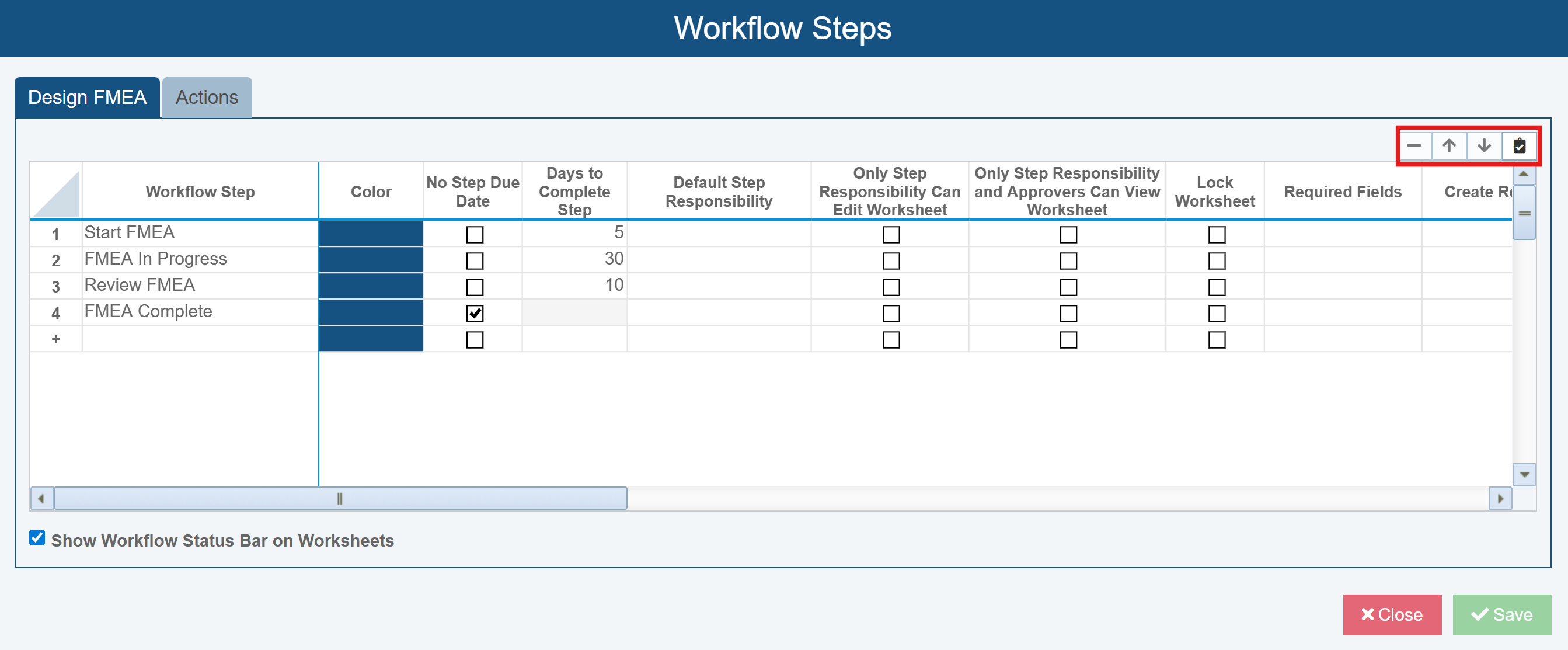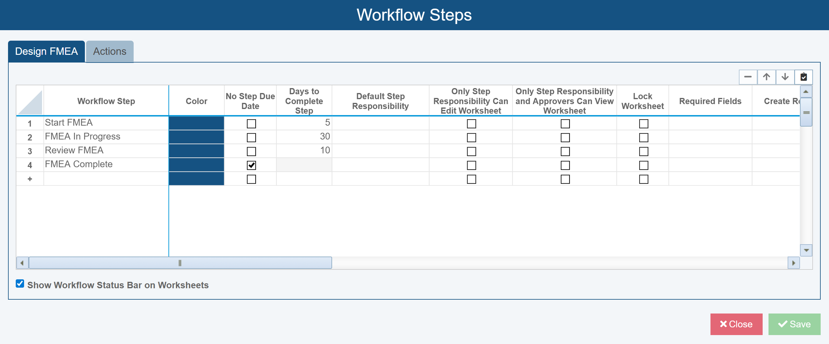 When you have completed defining your FMEA Workflow, click Save. You can make modifications to your Workflow at any time. When complete, click Close.