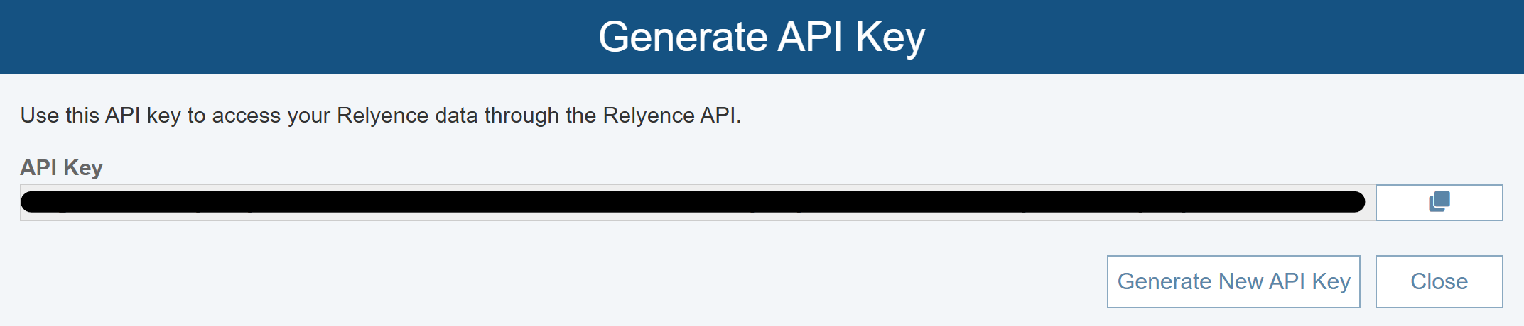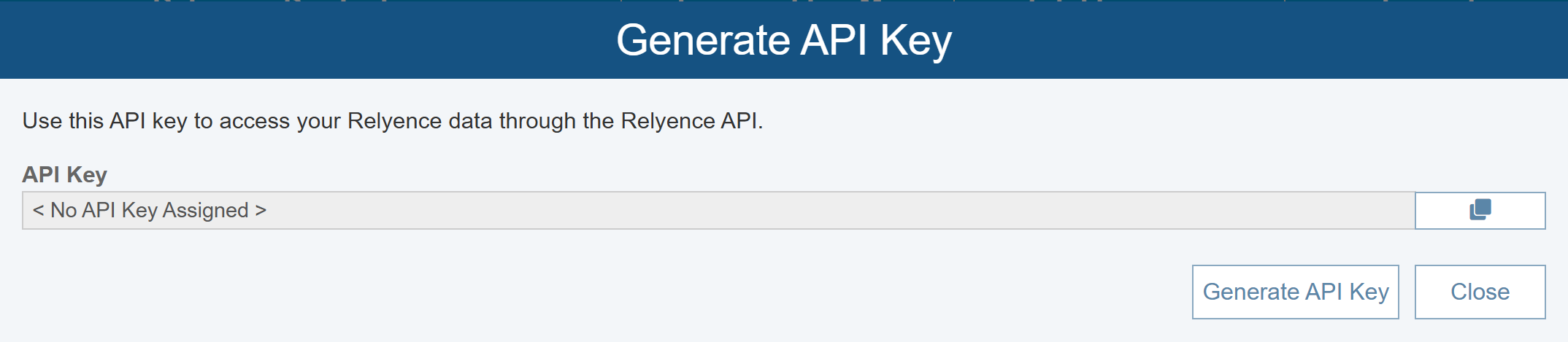 Click the Generate API Key button to generate your unique Relyence API Key. Your API Key will appear in the API Key field for you to copy and paste as needed.