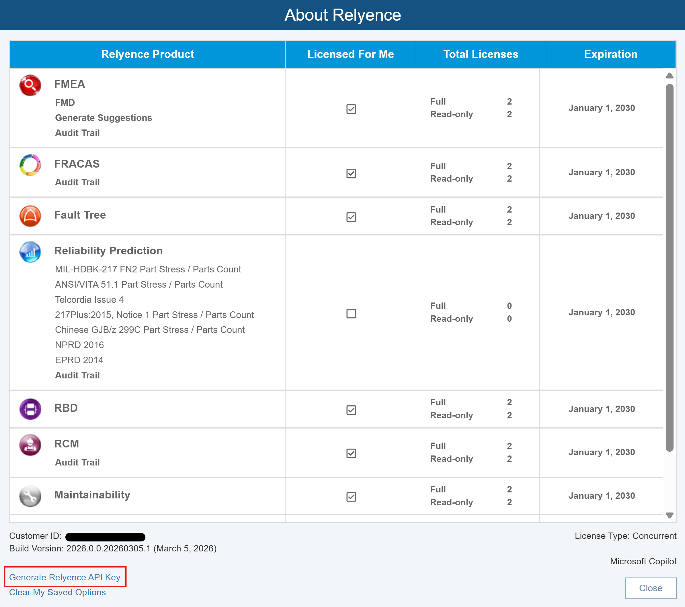 To generate your Relyence API Key, click About Relyence from the Help menu. The About Relyence dialog appears. Click the Generate Relyence API Key link. (Note: If the Generate Relyence API Key link does not appear, you do not have permission to generate an API Key. Your Relyence Administrator controls this setting.)
