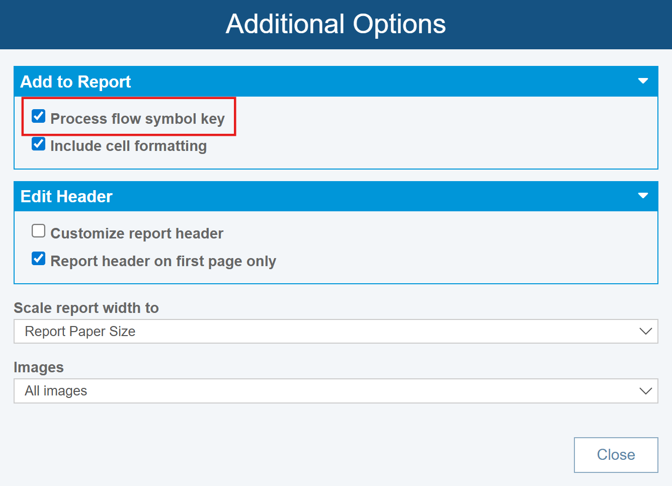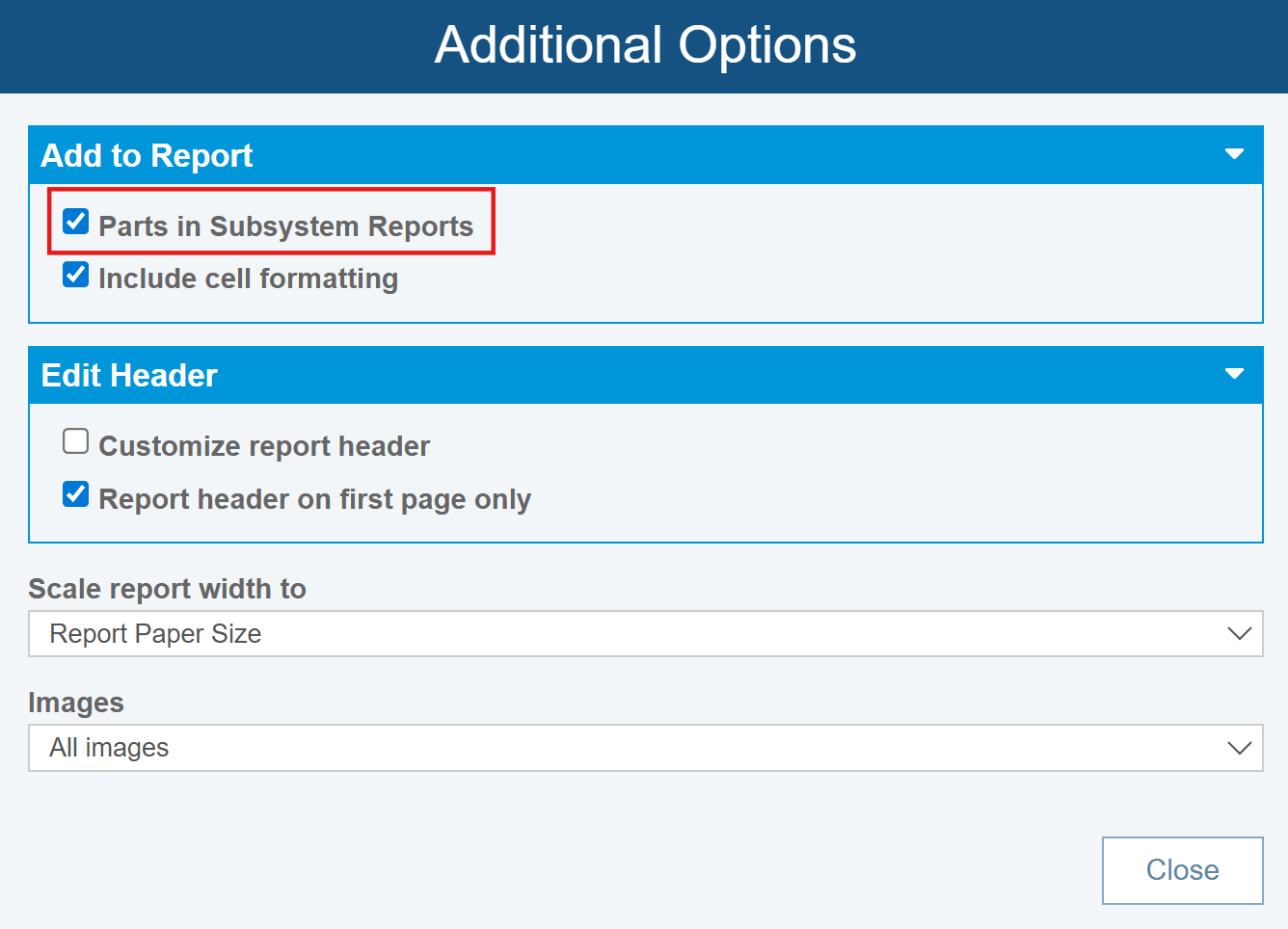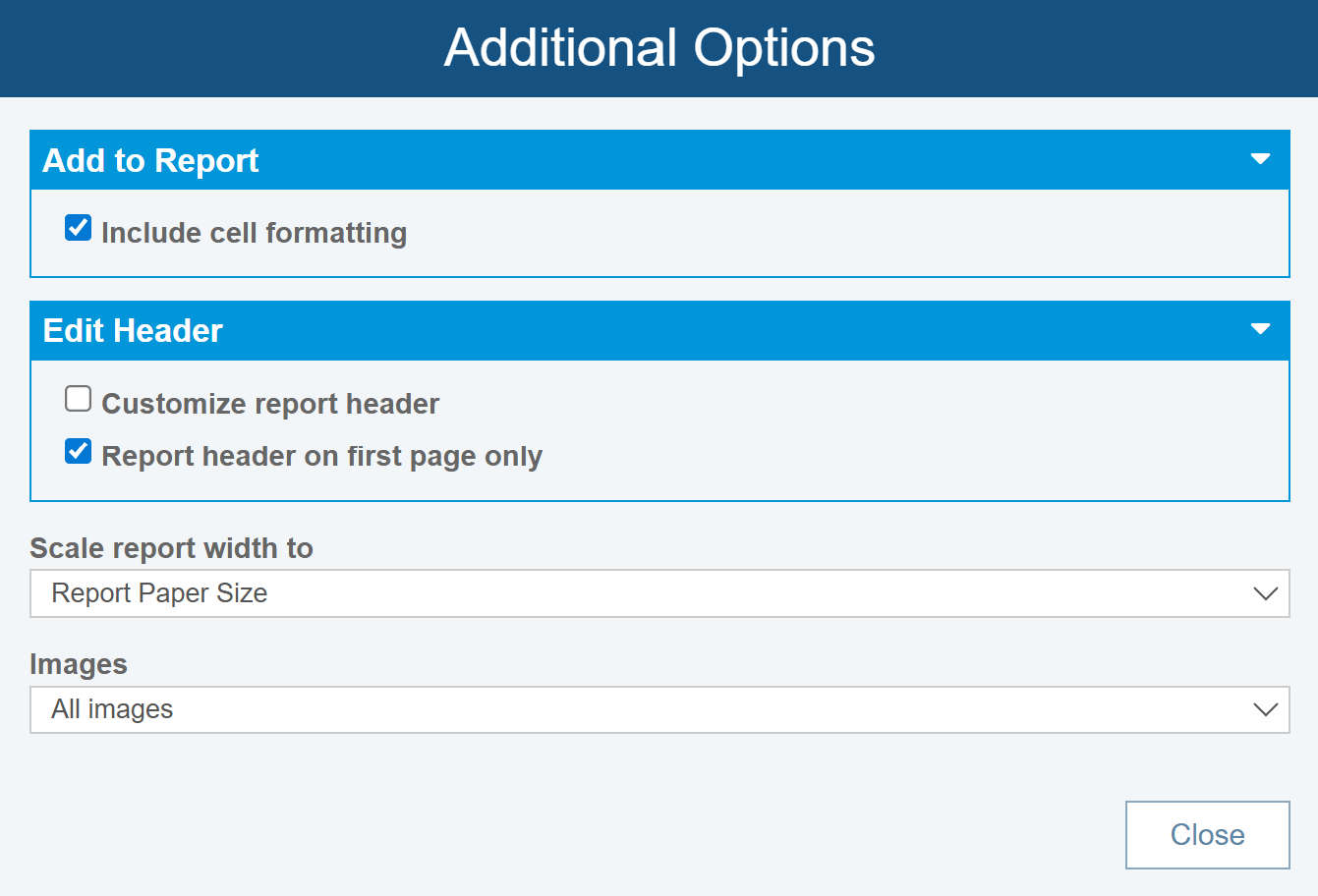 Once you've set the Additional Options, click Close to return to the Report Options dialog.