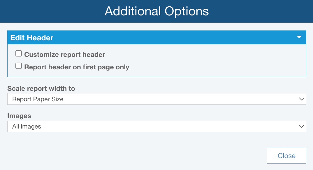 Once you've set the Additional Options, click Close to return to the Report Options dialog.