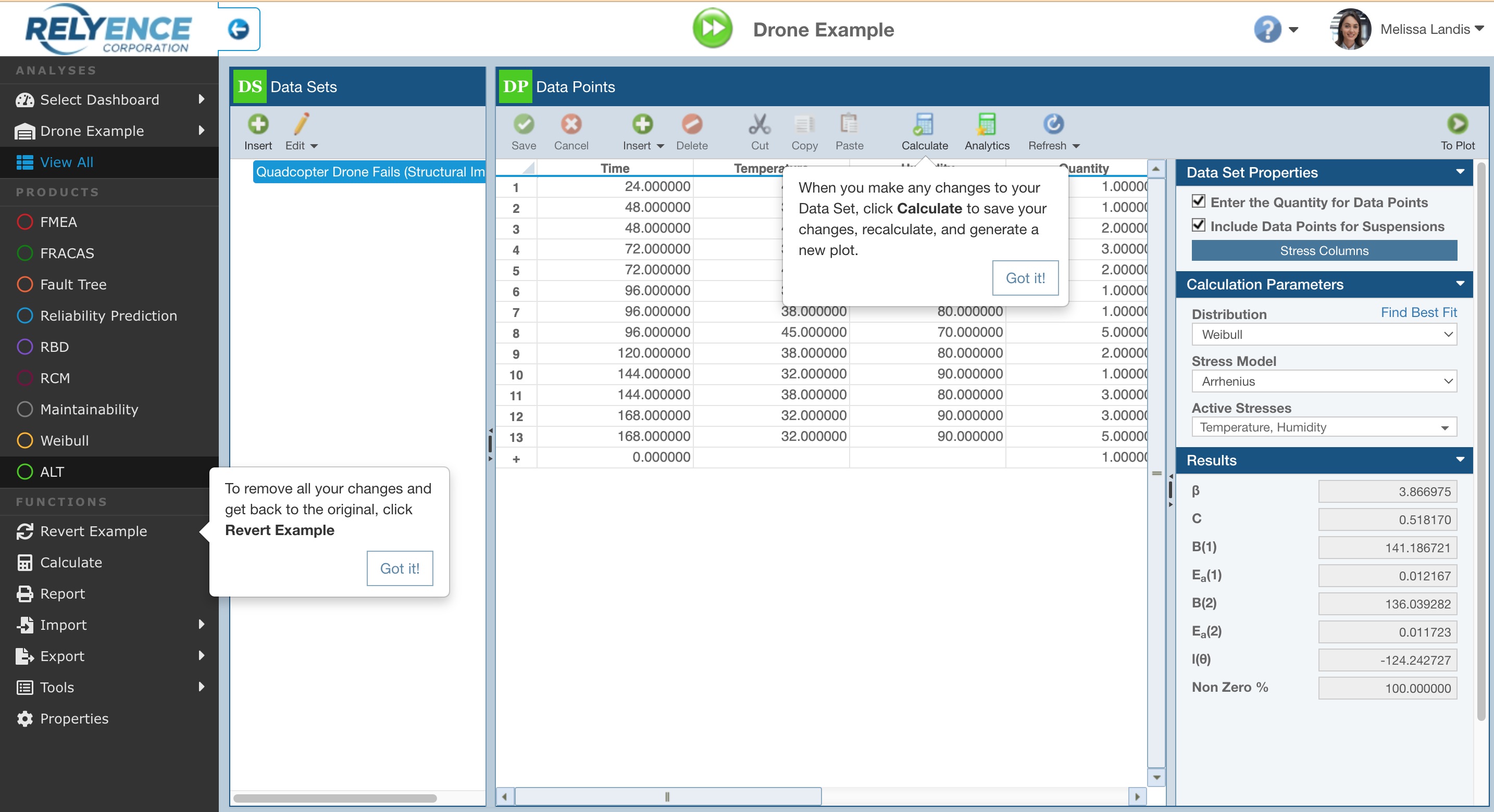 When using Relyence ALT, any time you make a change to your ALT Data Set, Data Set Properties, or Calculation Parameters, you will need to recalculate to view the new results and new ALT Plot. Clicking the Calculate button on the ALT toolbar - highlighted by the Calculate pop up message - is an easy way to do this. Any time you create a new ALT Analysis, the Calculate pop up will appear as a reminder.