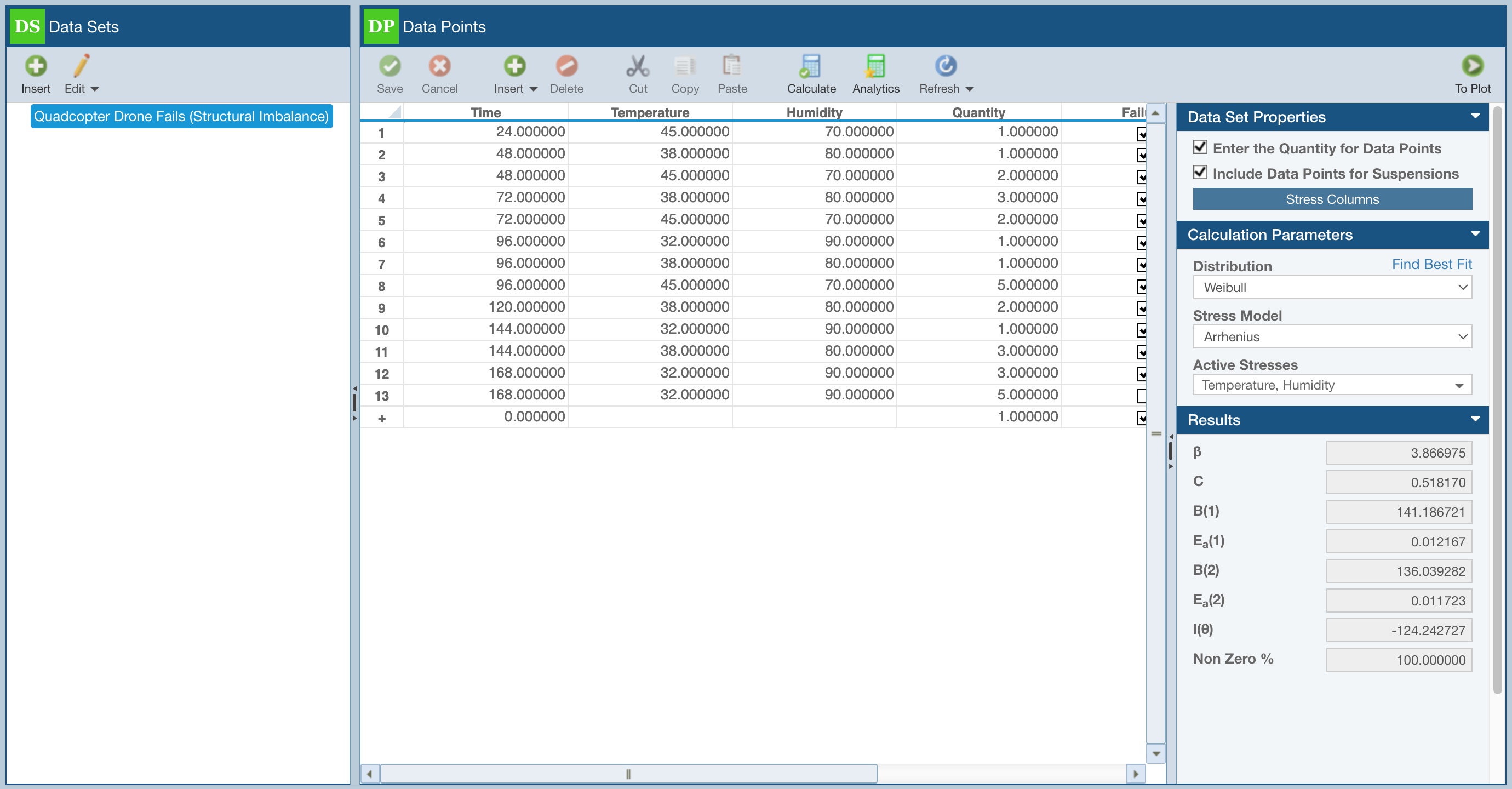 You will see the Data Points Table filled in with a random set of 25 Failure Times and Stress values.