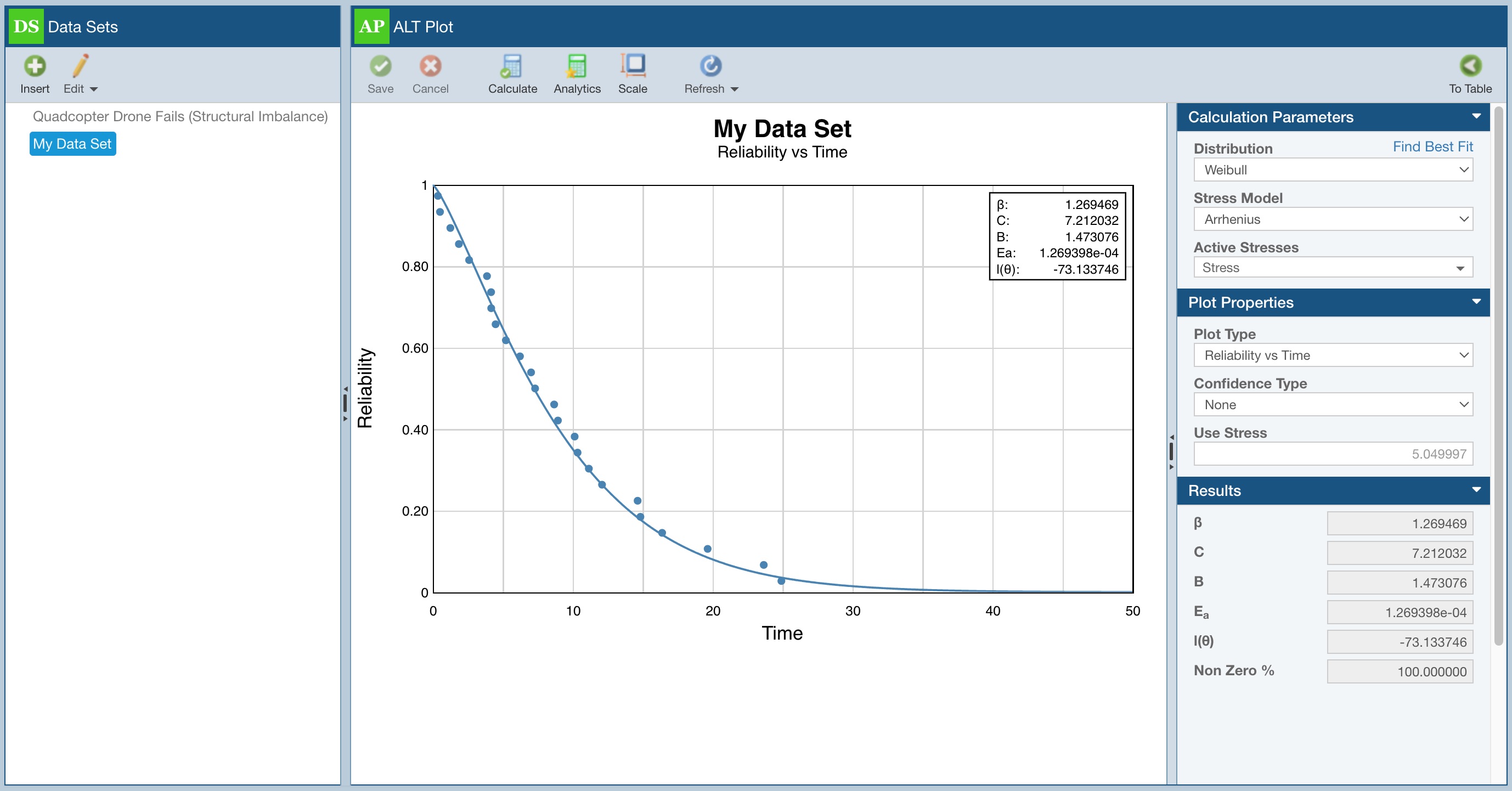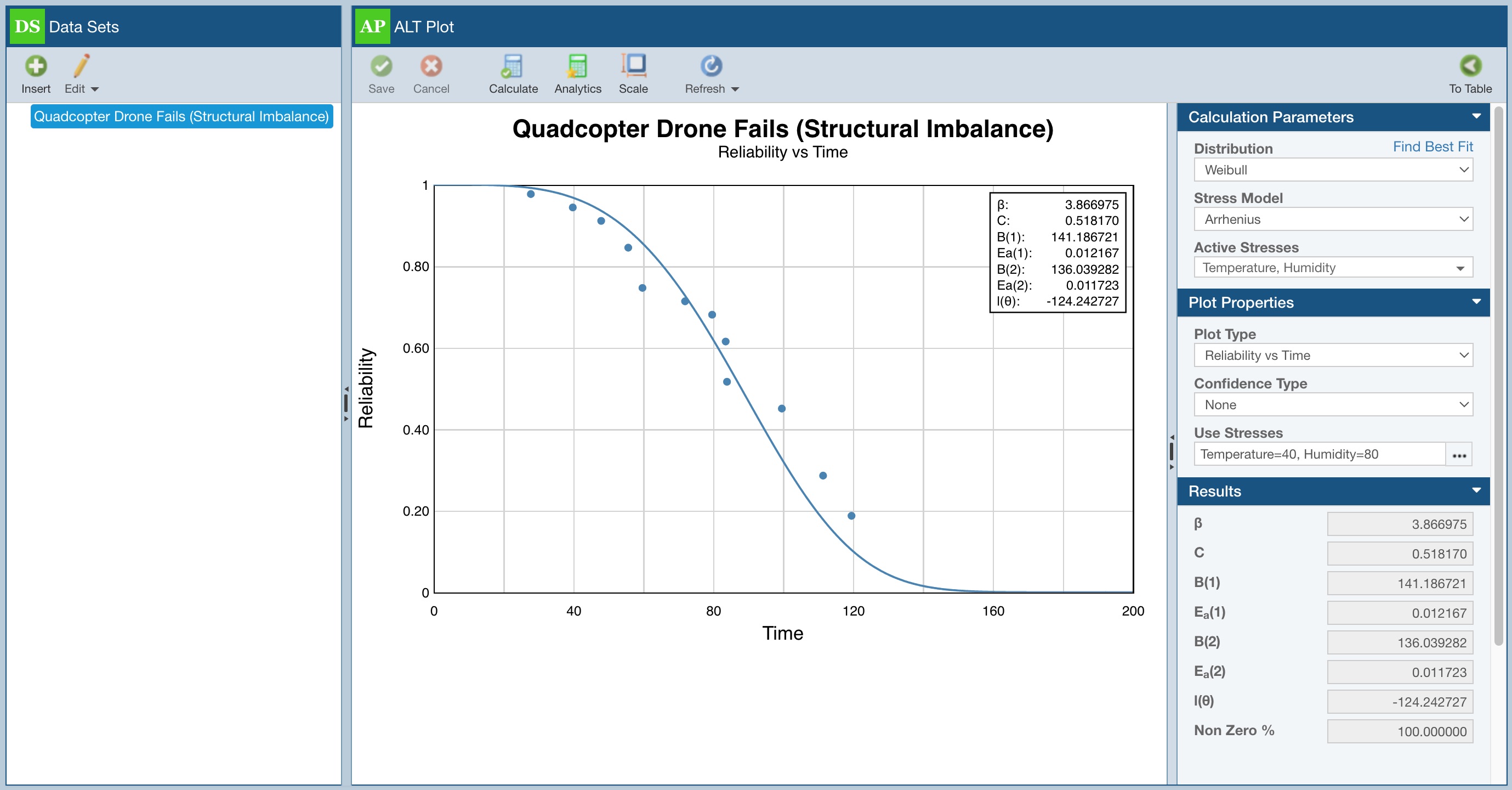 The center pane is now replaced with the ALT plot. The ALT plot displays the data points along with the curve fit of the data.