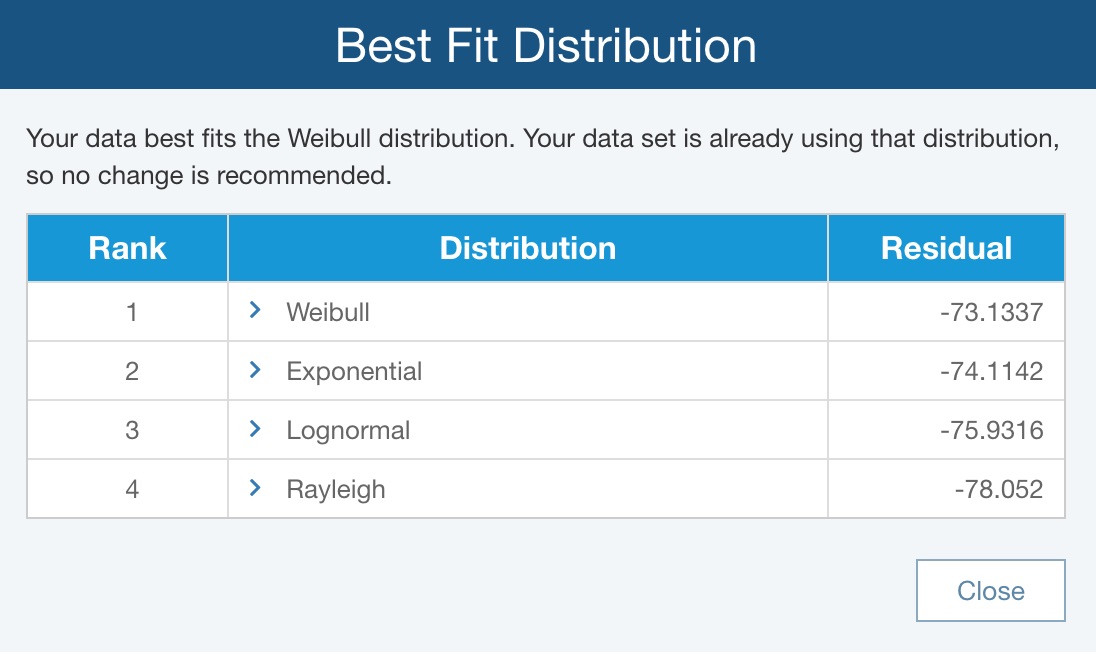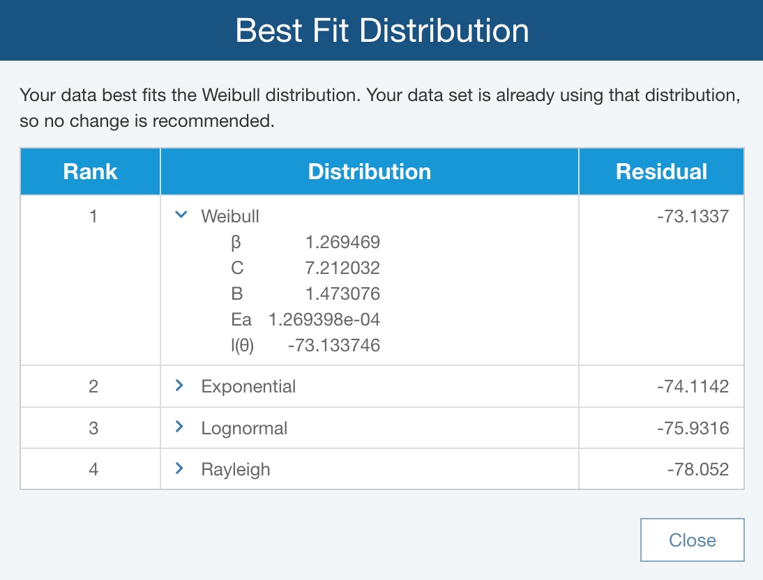 For this example, set the Distribution to the recommendation from the Best Fit analysis, and click Close.