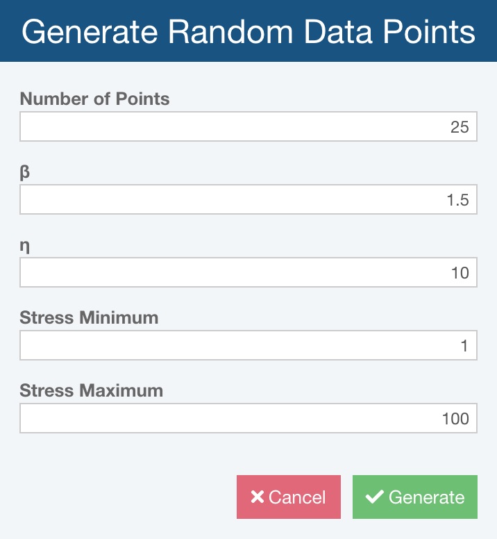 The Generate Random Data Points dialog appears. Enter "25" for the Number of Points, leave the other parameters at their default values: Beta = 1.5, Eta = 10, Stress Minimum = 1, and Stress Maximum = 100.