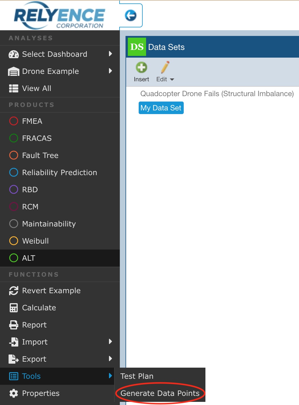 For this example, we are going to generate a random set of numerical values to use for our Data Set. Relyence has a tool to make this easy. From the Sidebar, click Tools>Generate Data Points to create a Data Set. This feature is available for some quick and easy testing if you don't have real failure data available; it is not intended to be used for any other purpose. Otherwise, Data Set data points can be entered manually, by copying from Excel or via importing from Excel. Also note that on the Data Points Table in Relyence ALT, keyboard support for Insert is supported using the <Insert> key and <Ctrl>+<Shift>+<NumPad +>.