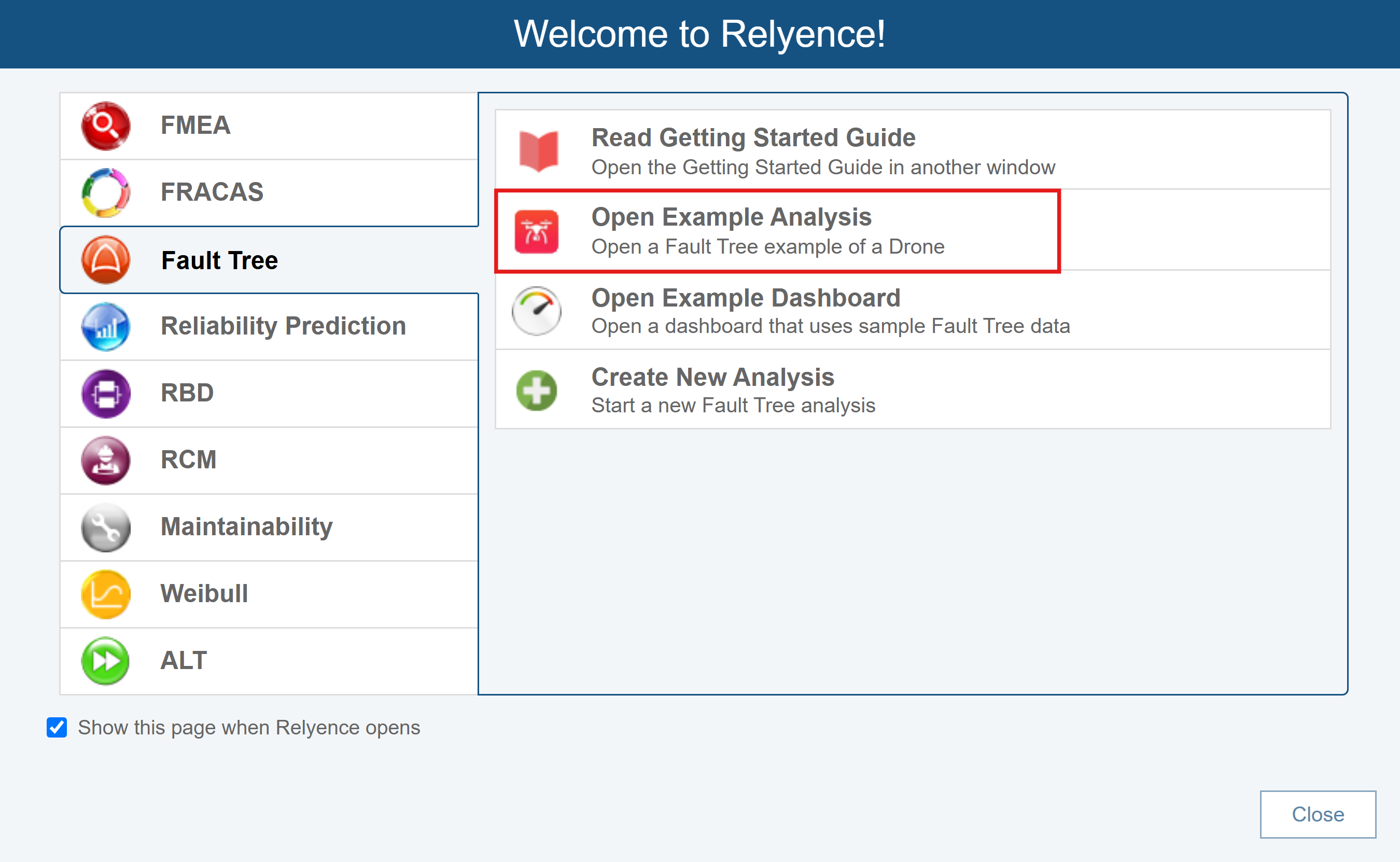 Click the Fault Tree tab on the left to activate Relyence Fault Tree. Then click Open Example Analysis.