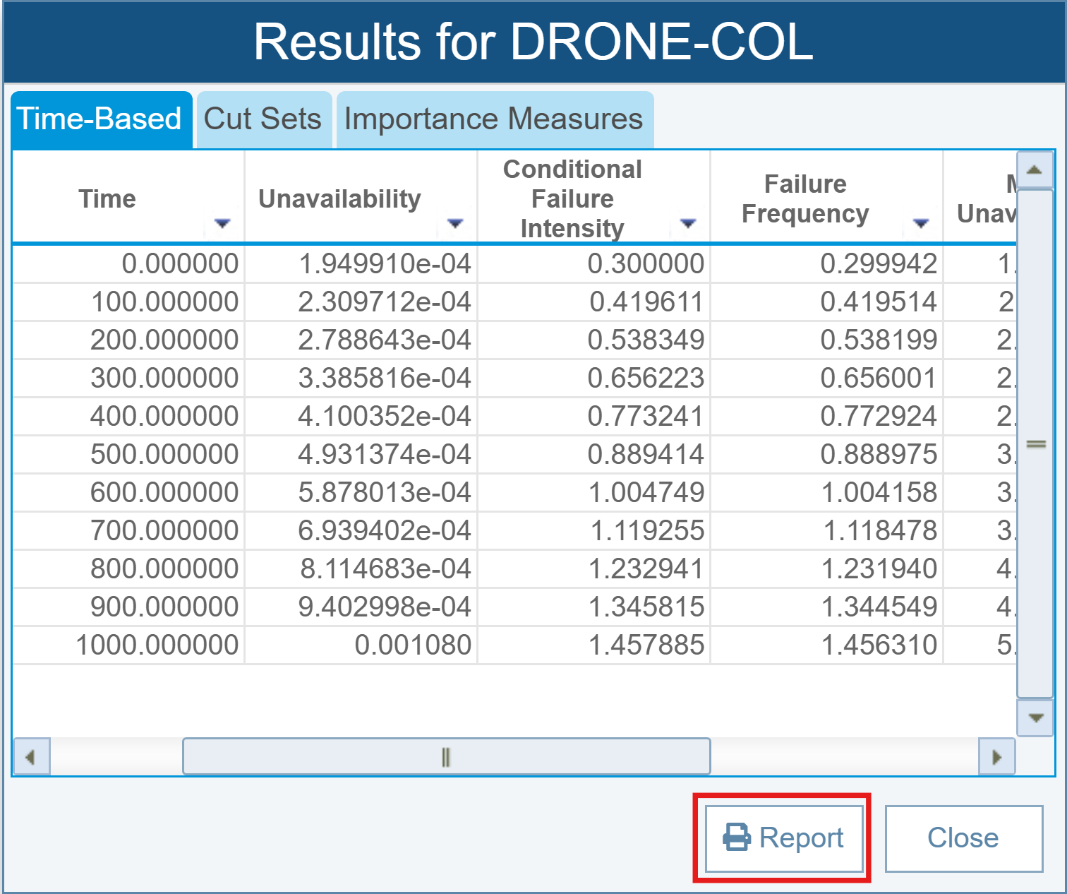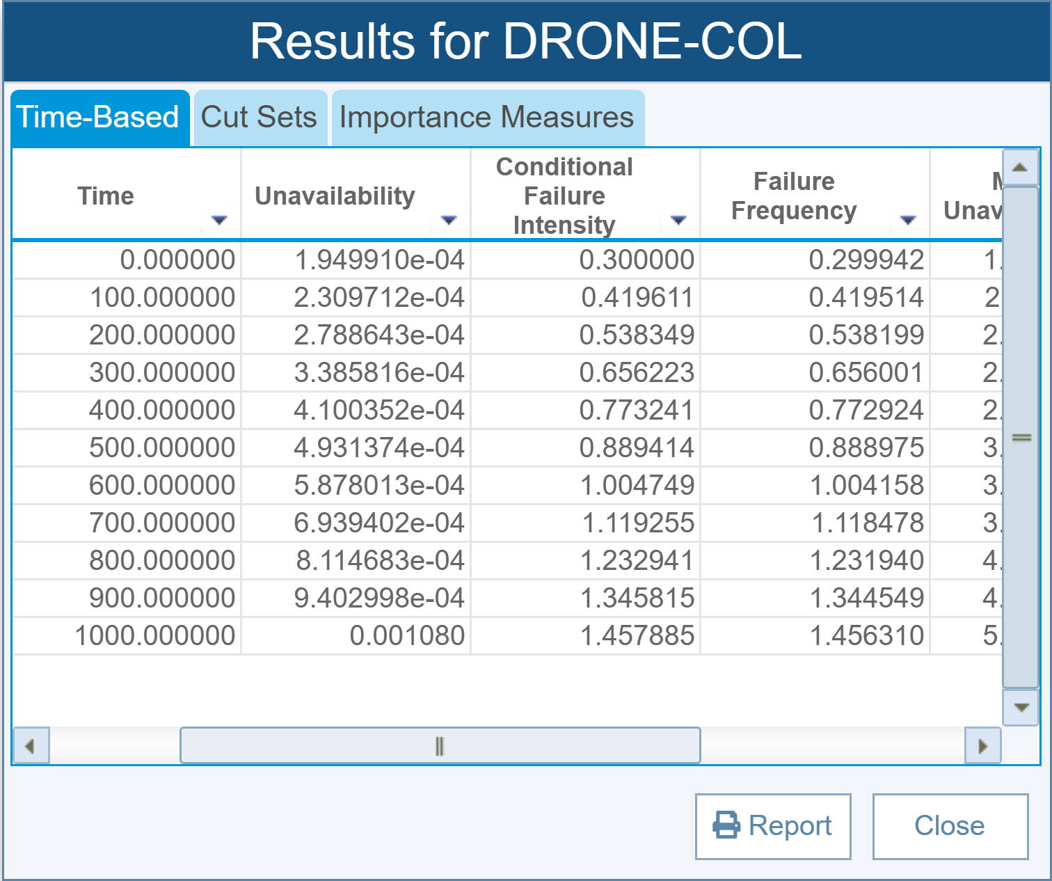 A progress bar will appear to indicate calculation progress. Once the calculation is complete, the Results dialog is displayed. Three tabs display the results for your time-based computations, cut sets, and importance measures.