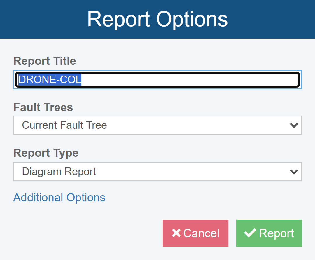 To generate a report of your fault tree diagram, click Report from the Sidebar. The Report Options dialog appears.