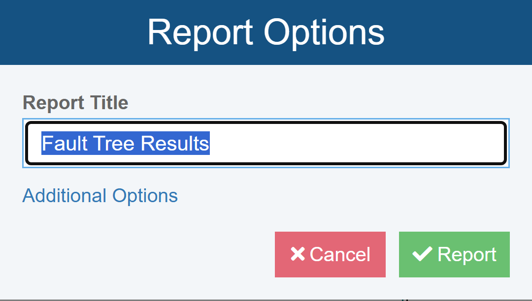Note that you can click the Additional Options link to set additional reporting options. See Generating Fault Tree Reports for more details.