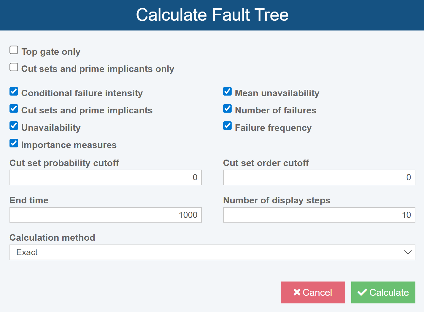 There are various options available for fault tree calculations. For more information on these options, refer to the Performing Fault Tree Calculations section. For now, make sure these selections are set for this calculation: