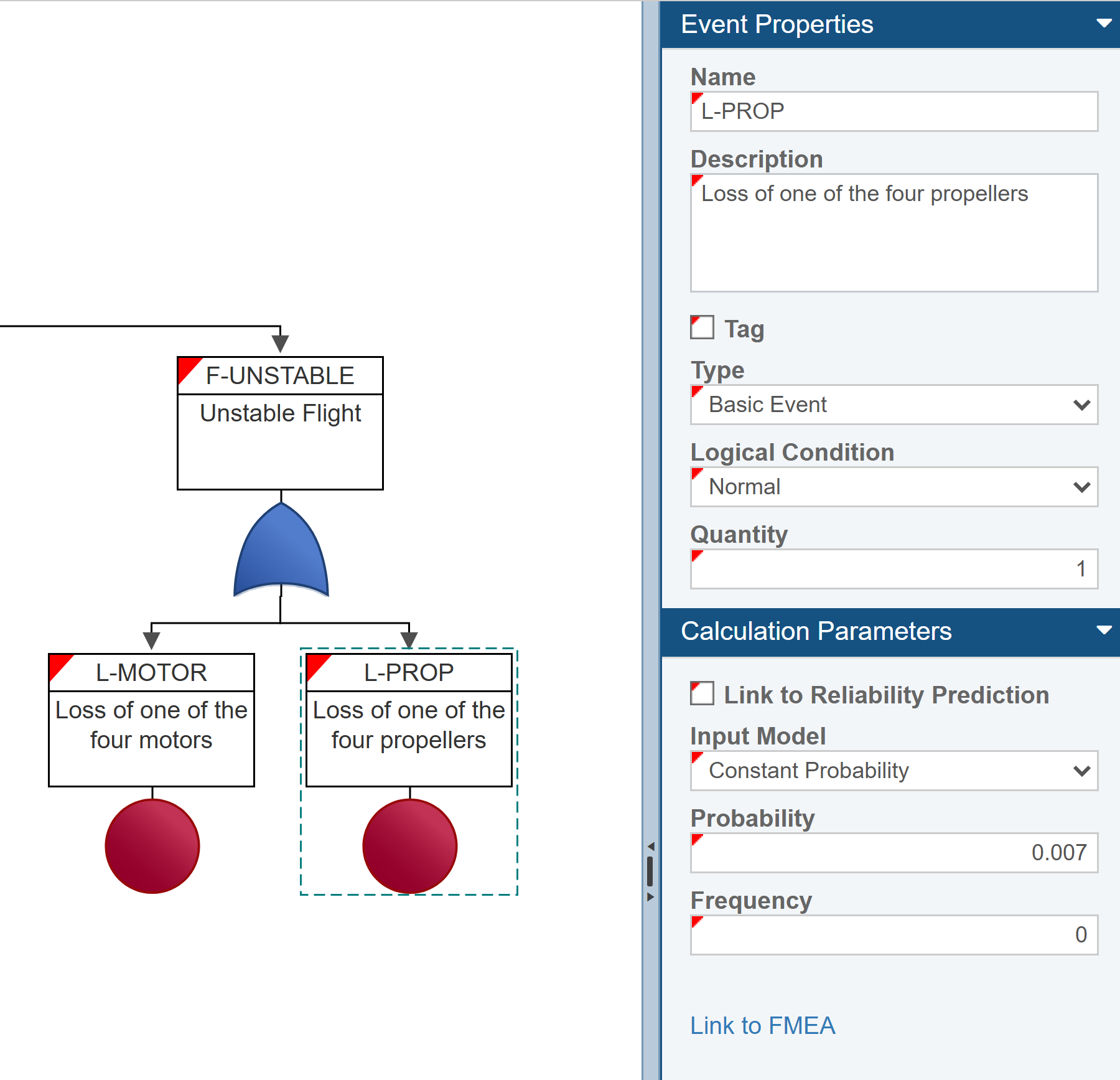 Select the first newly entered event by clicking it to show its Properties. Rename this event to "L-MOTOR", enter the Description "Loss of one of the four motors", and enter "0.03" for the Probability. Select the second event entered and enter the name "L-PROP", the description "Loss of one of the four propellers", and enter "0.007" for the Probability.