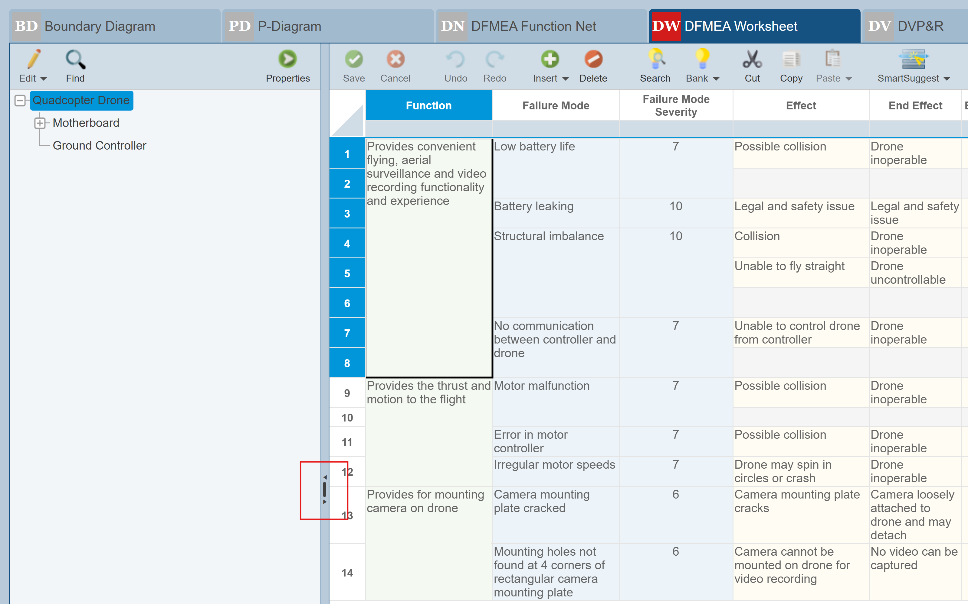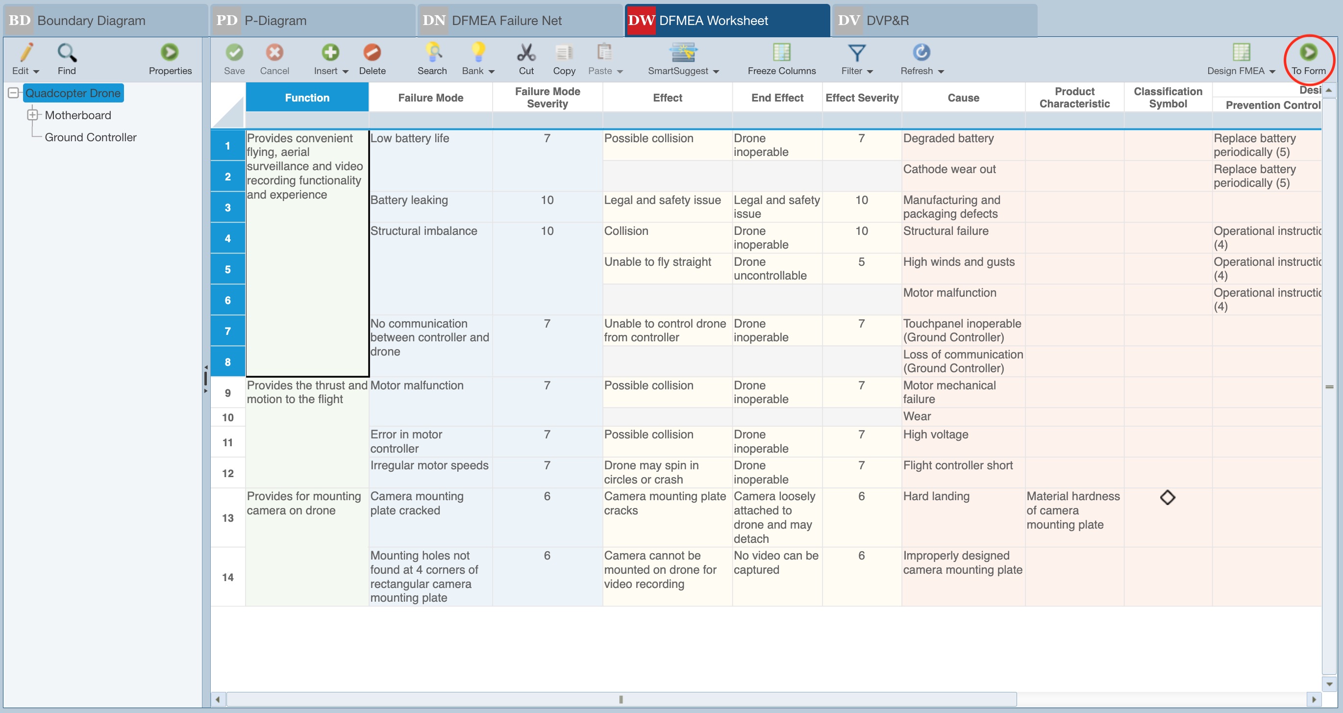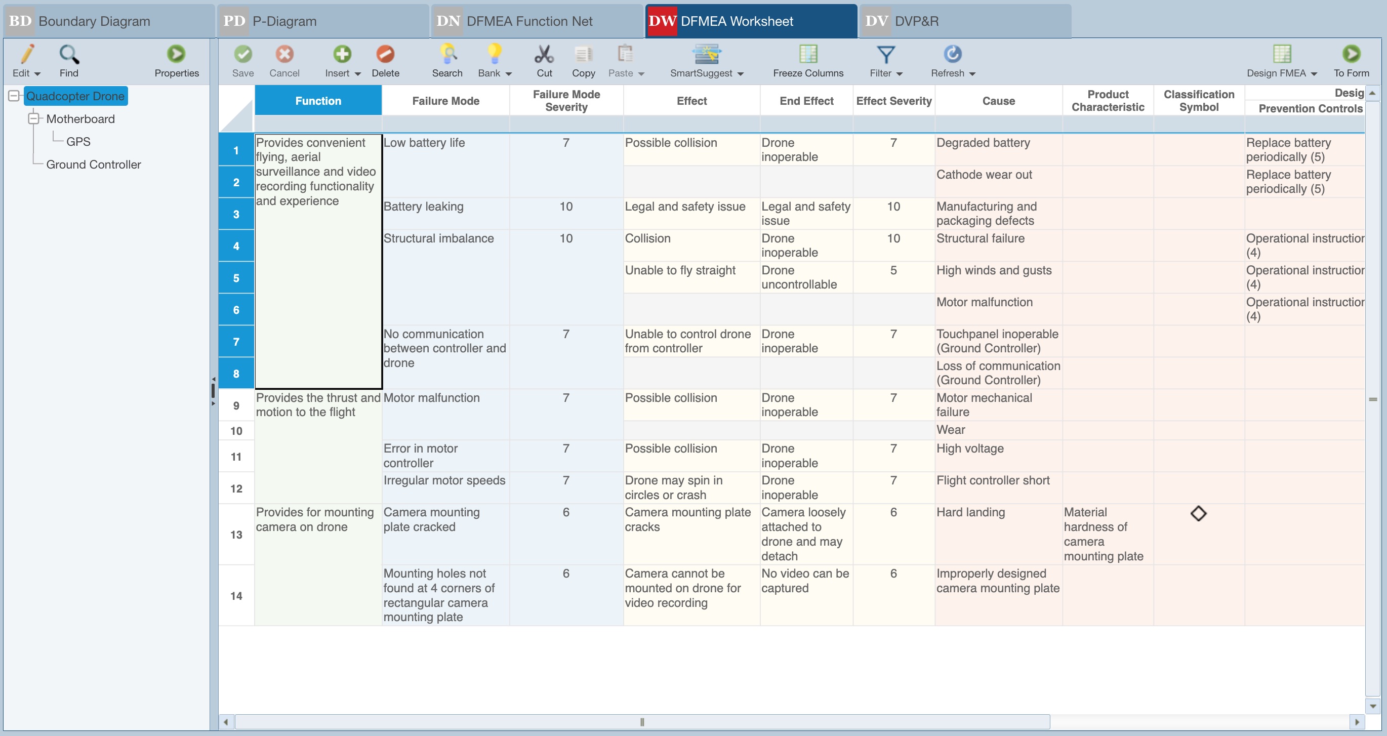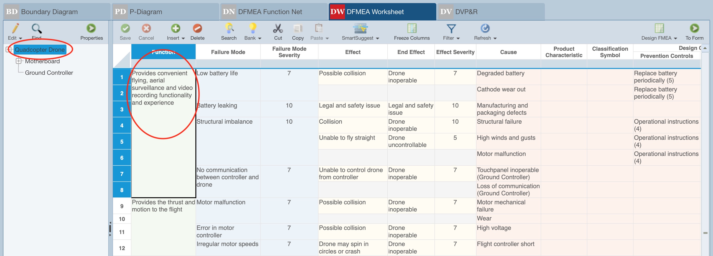 Make sure the Quadcopter Drone is selected in the Analysis Tree. Click on the third function in the DFMEA Worksheet "Provides for mounting camera on drone".