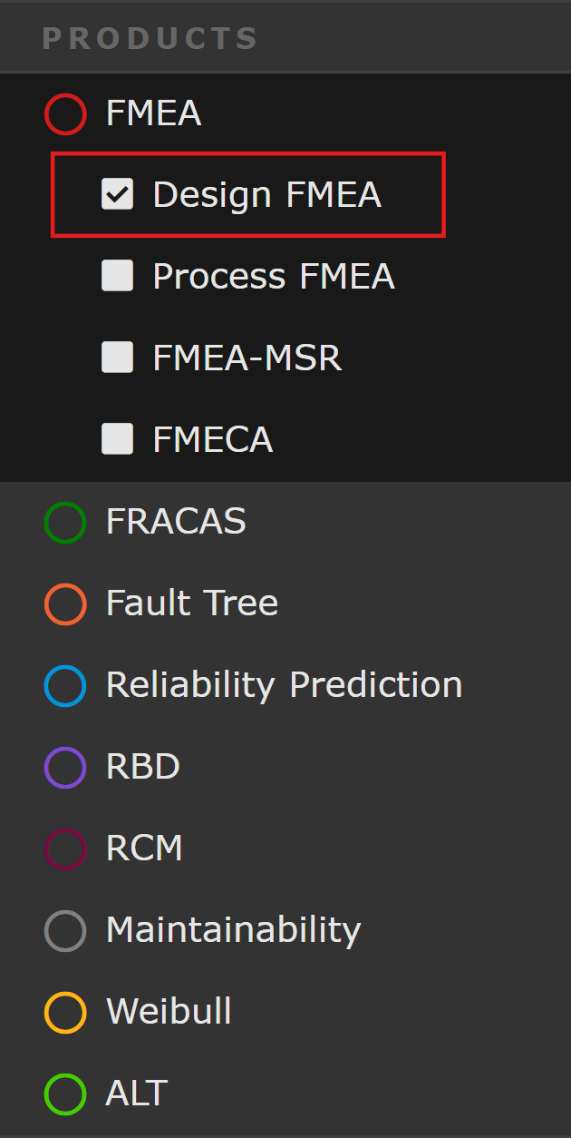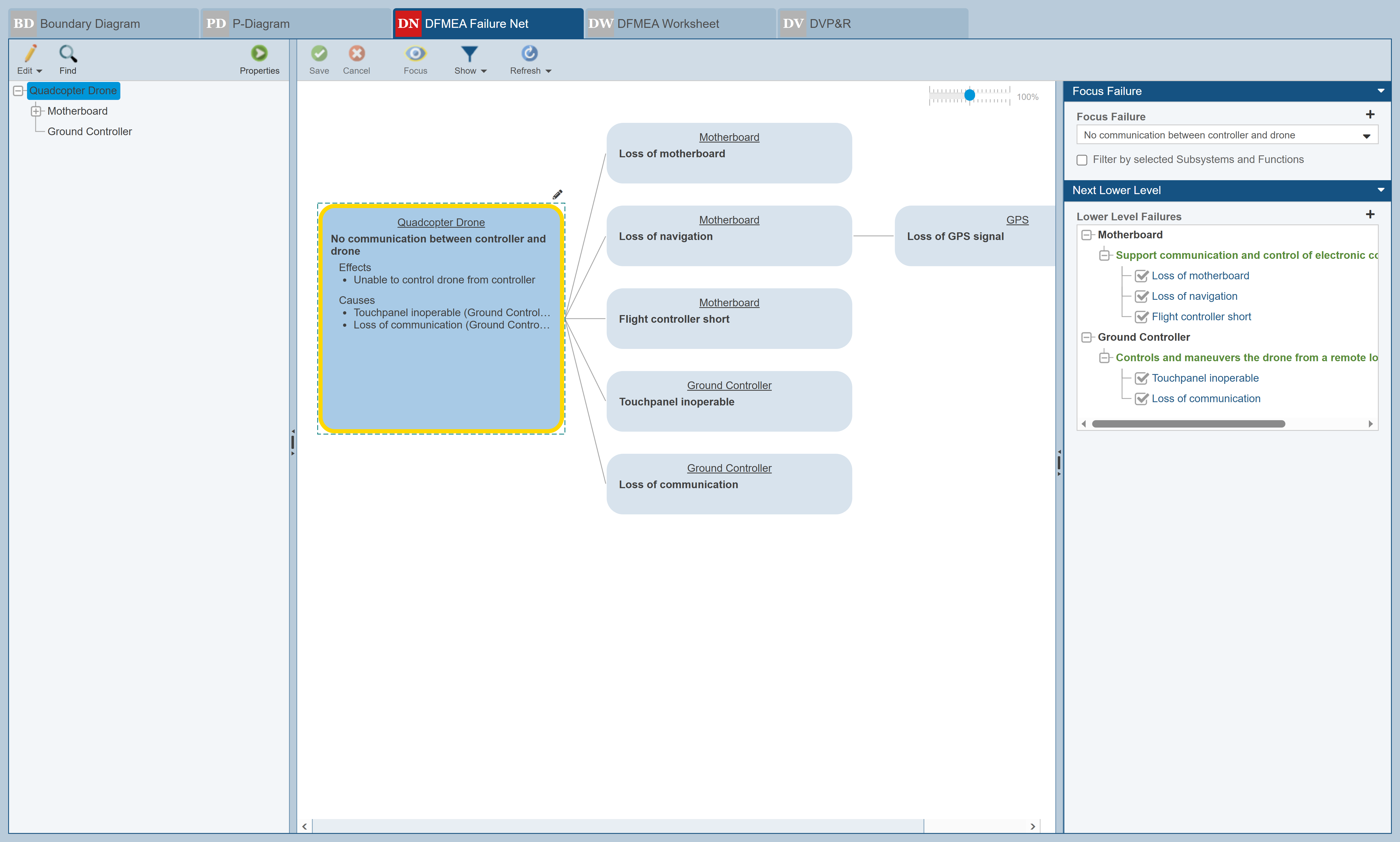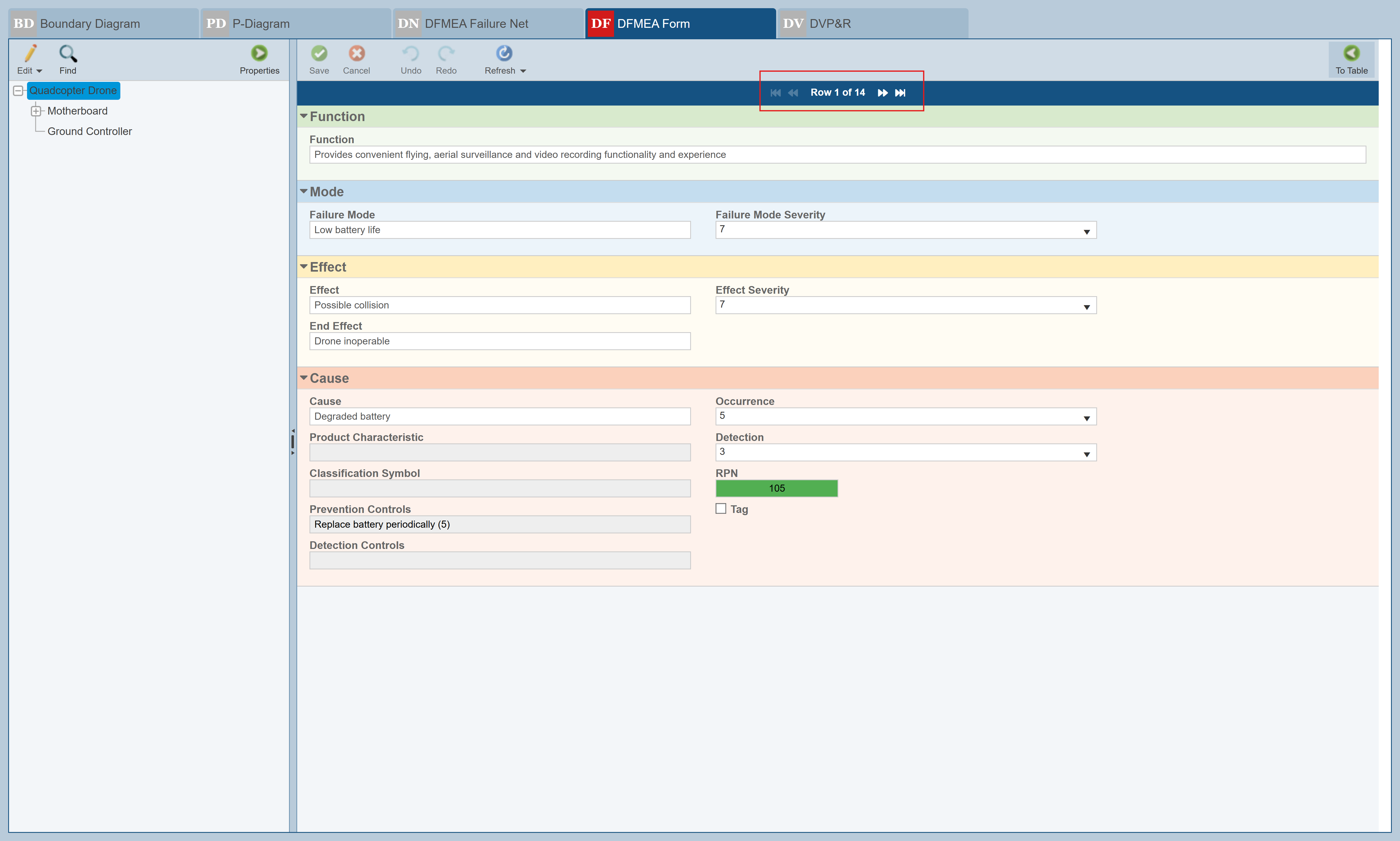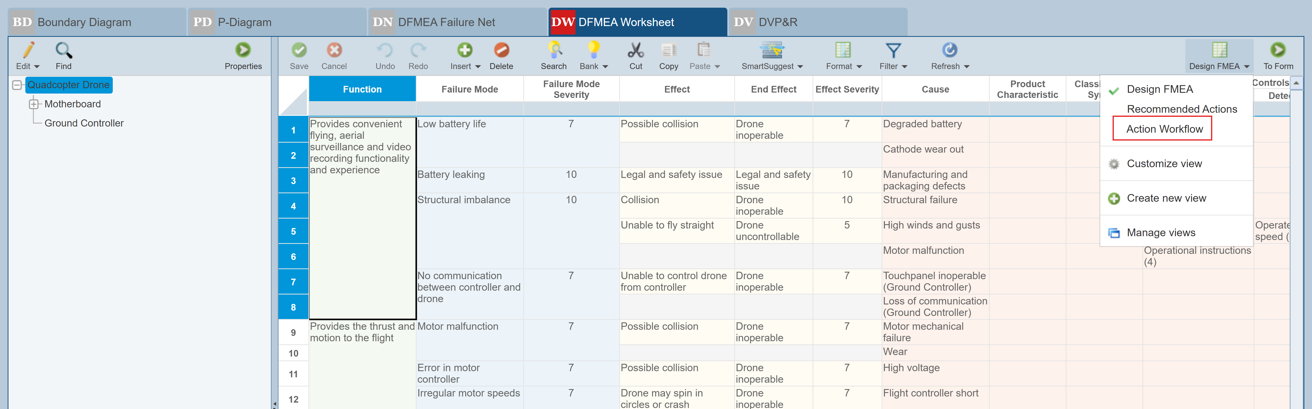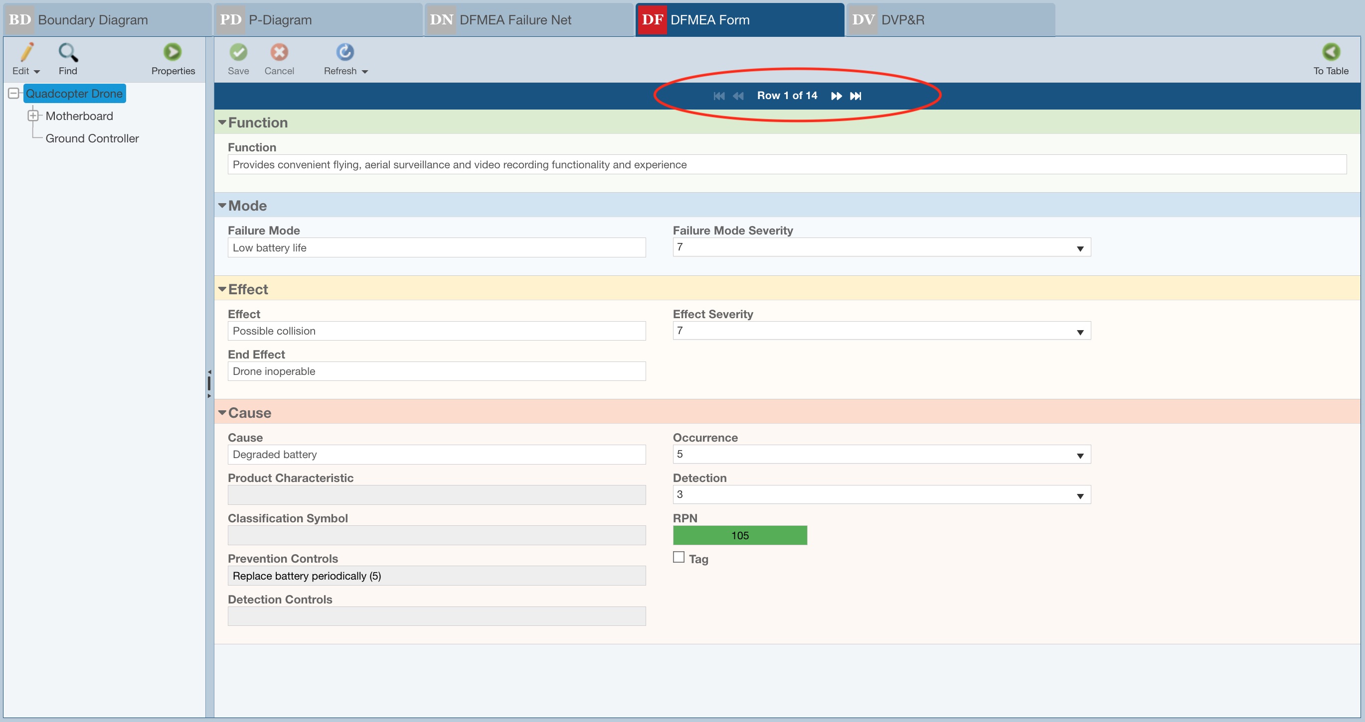 The Drone Example includes both a sample Design FMEA and Process FMEA, as well as sample FMEA-MSR and FMECA data. Make sure that the Design FMEA is in view. If Design FMEA is not selected in the Sidebar, click to select it.