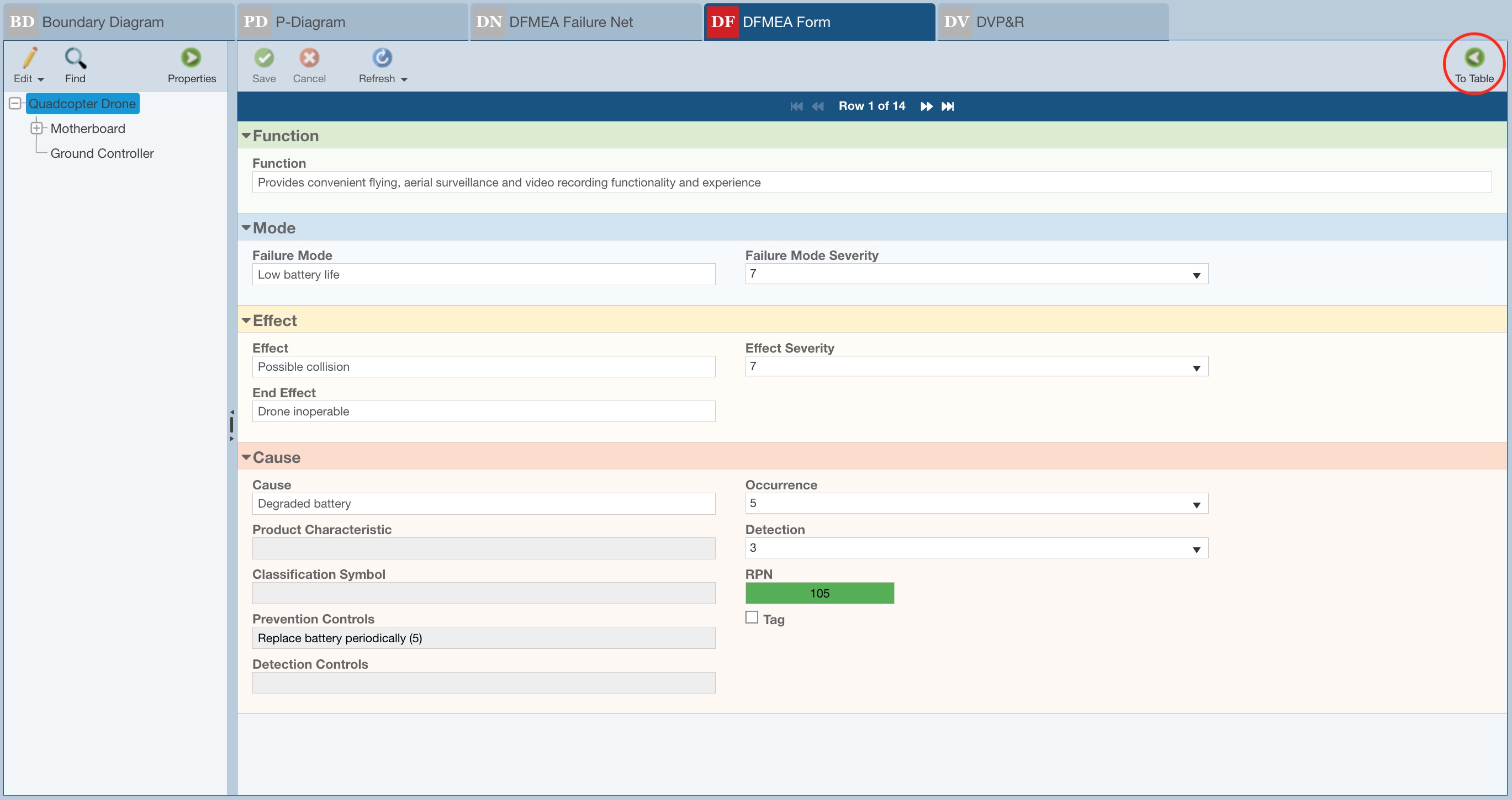 To go back to the FMEA Worksheet, click the To Table button in the toolbar.