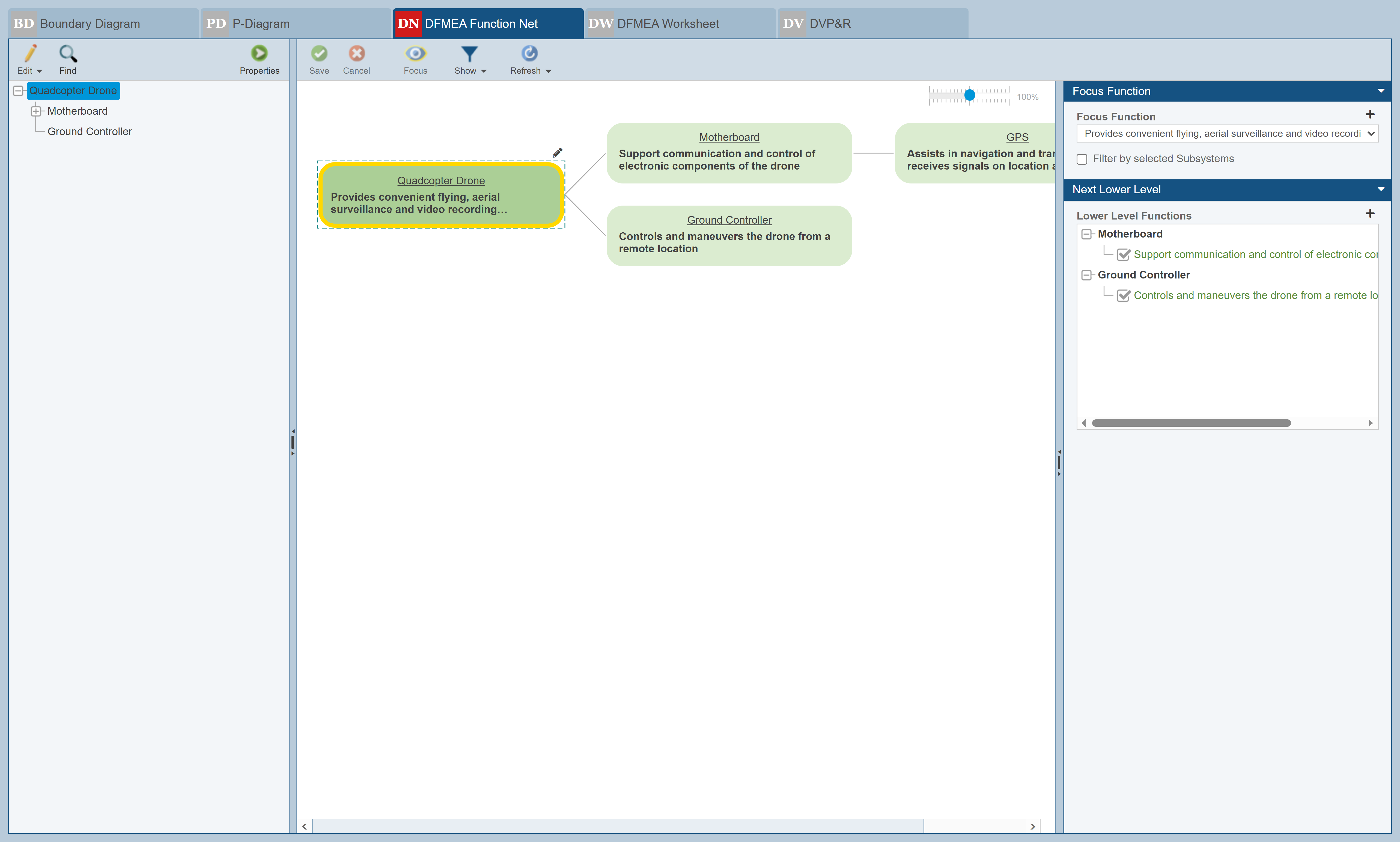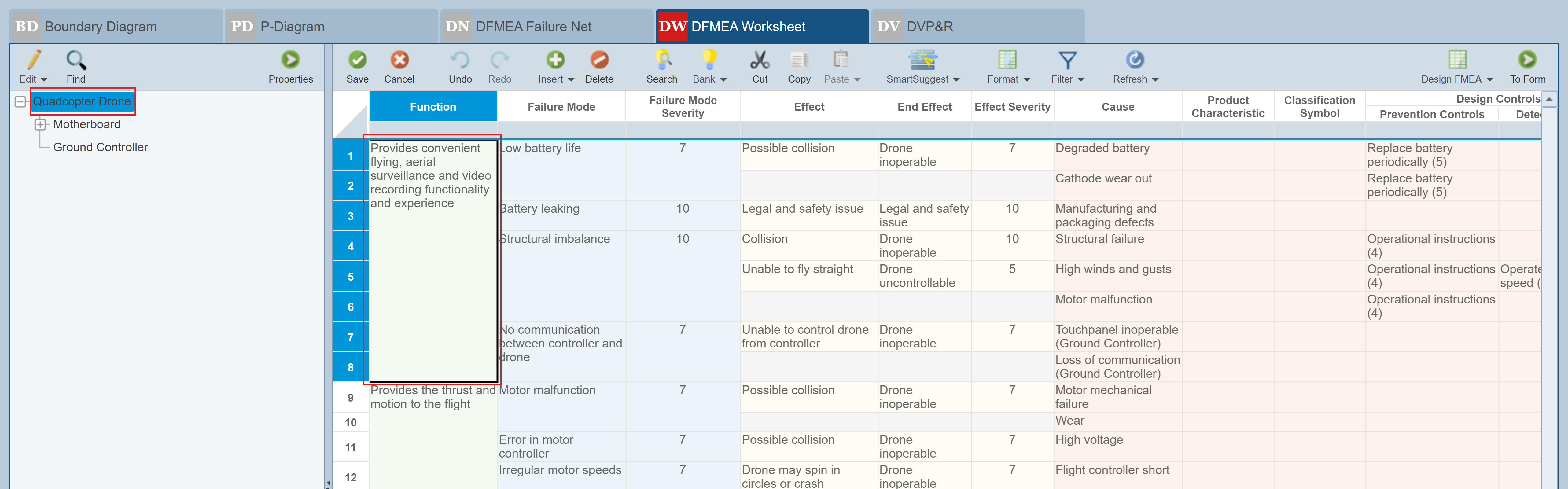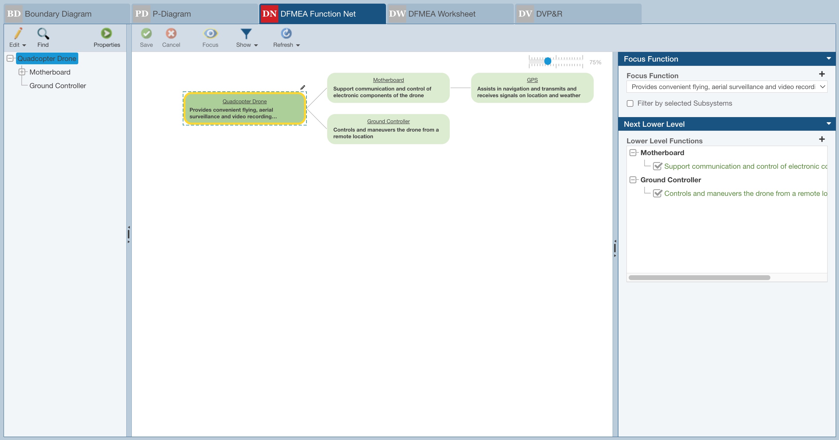 The DFMEA Function Net tab displays the example Function Net and Failure Net details for the Quadcopter Drone.