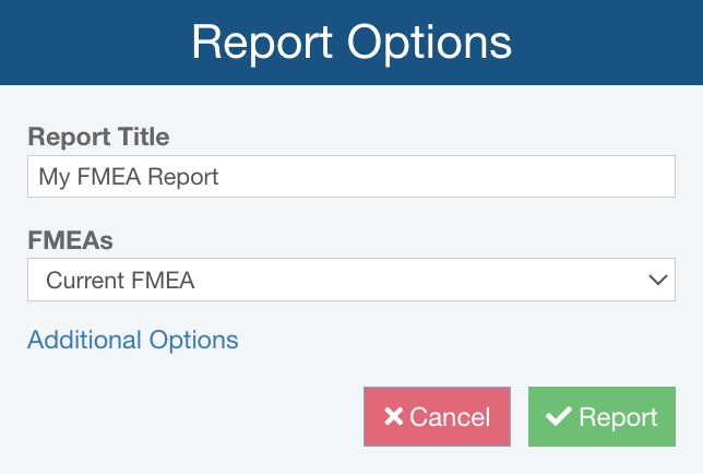 Note that you can click the Additional Options link to set additional reporting options. See Generating FMEA Reports for more details.