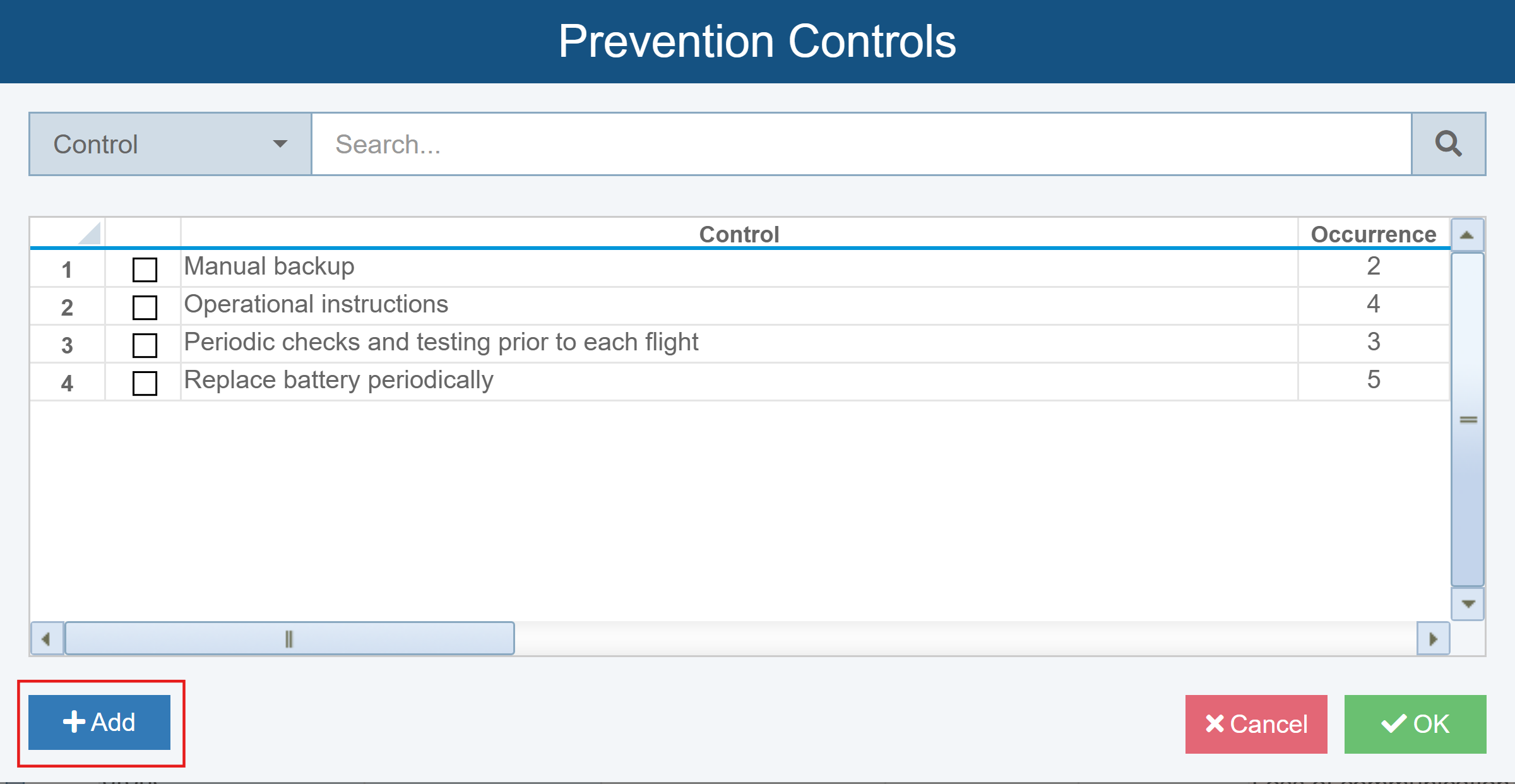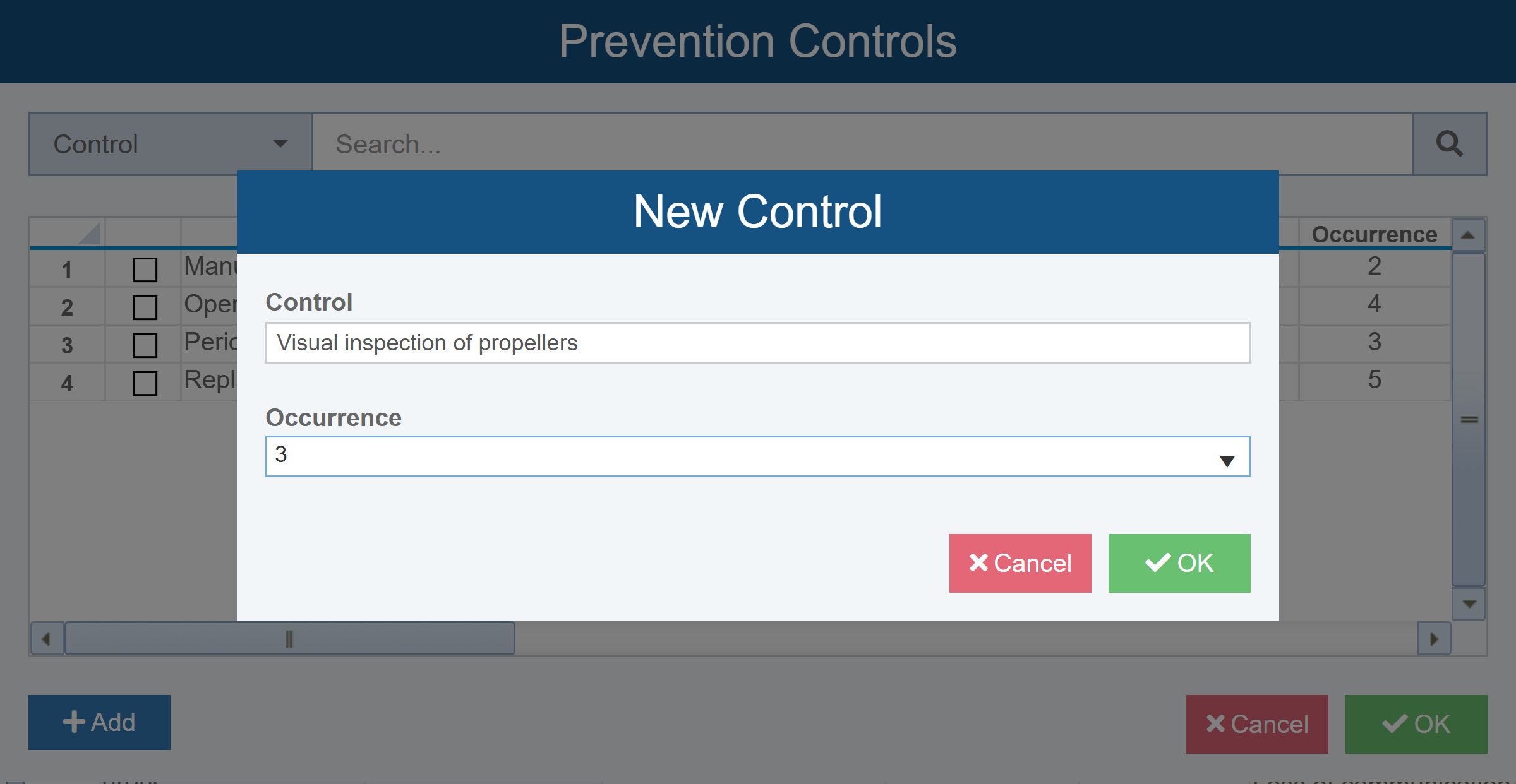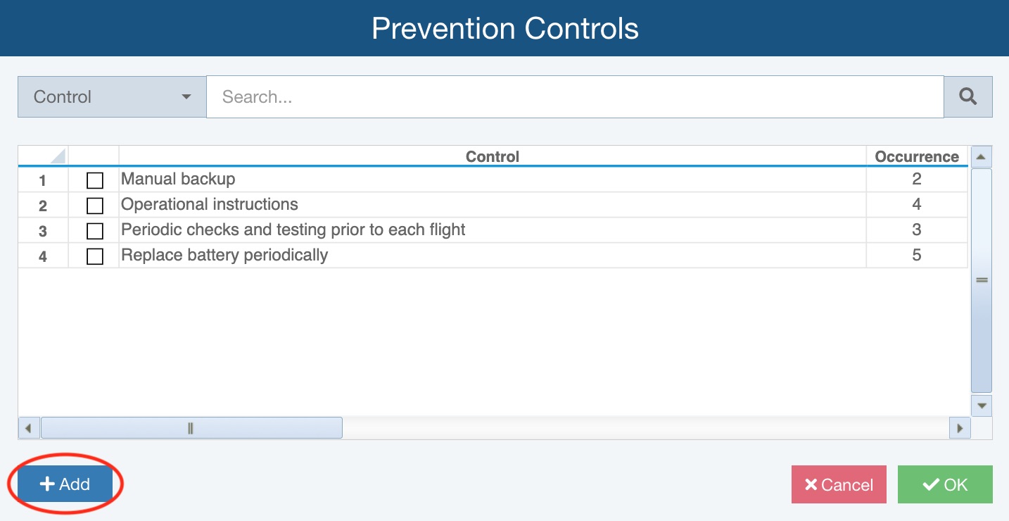 The new Control is added to the list and automatically selected; its corresponding Occurrence value is also entered in the Occurrence field and shown in parentheses within the Prevention Control field.