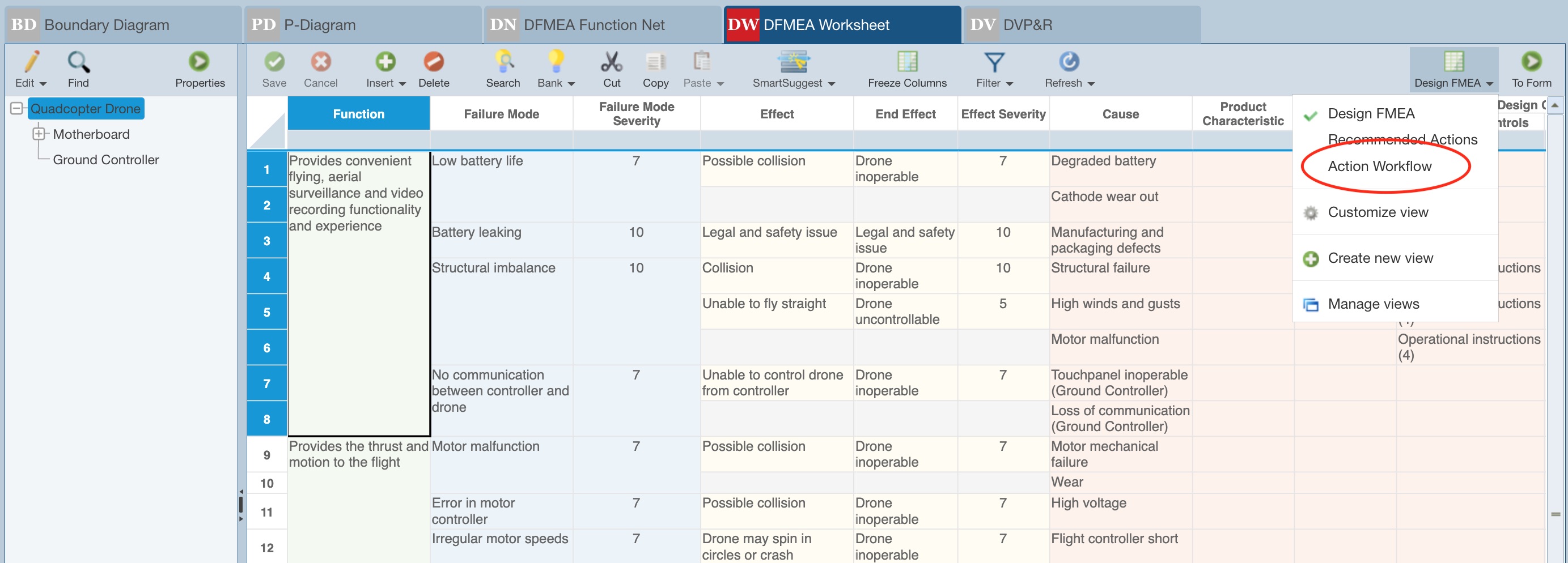 In the FMEA toolbar, the Design FMEA button indicates the current FMEA View that is active. You can have any number of Worksheet Views, and they can be customized to your needs. See the Customizing the FMEA Worksheets topic for more information. Click Design FMEA to bring up the list of choices and select Action Workflow.