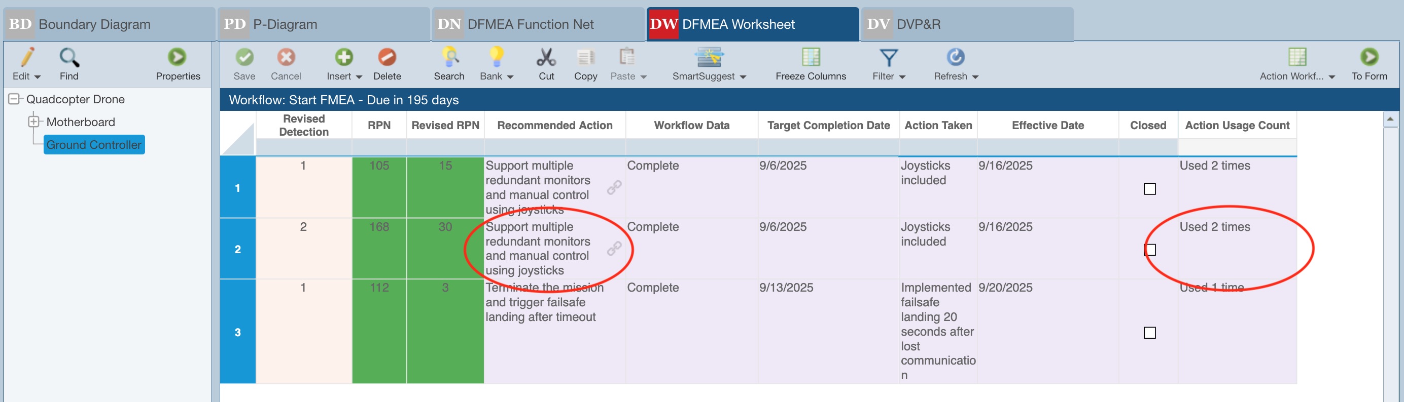 The Relyence Action Library stores all your Recommended Actions in a central location for reuse and updating efficiency. The link symbol in the Recommended Action field indicates that an Action is used in multiple places, and the Action Usage Count indicates how often it appears. For Actions which are shared, an update to one automatically updates all. For more details, see the Using the FMEA Action Library topic.