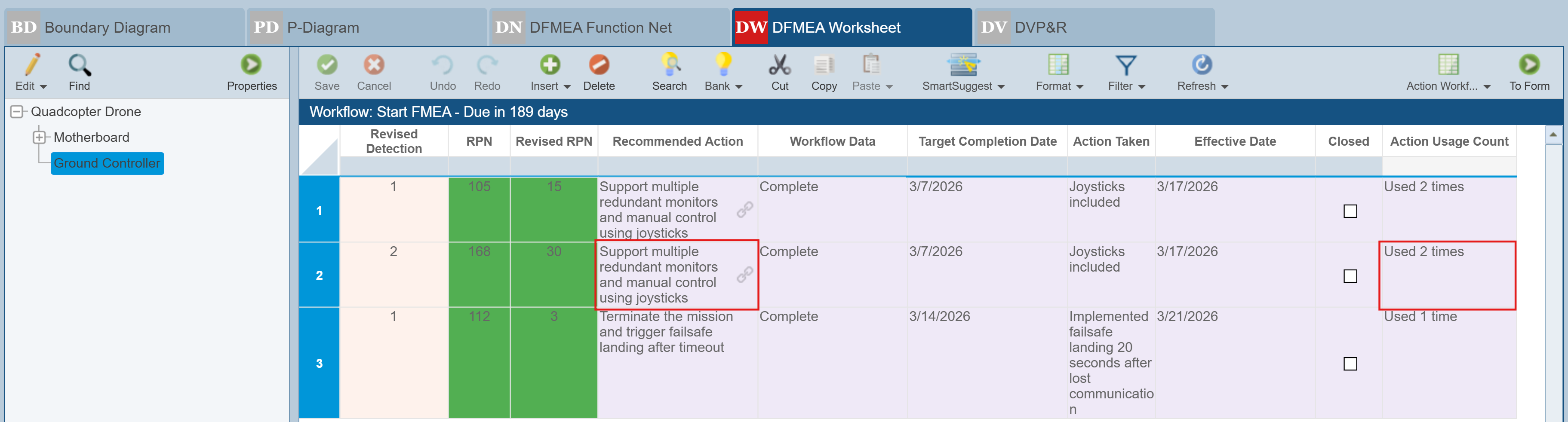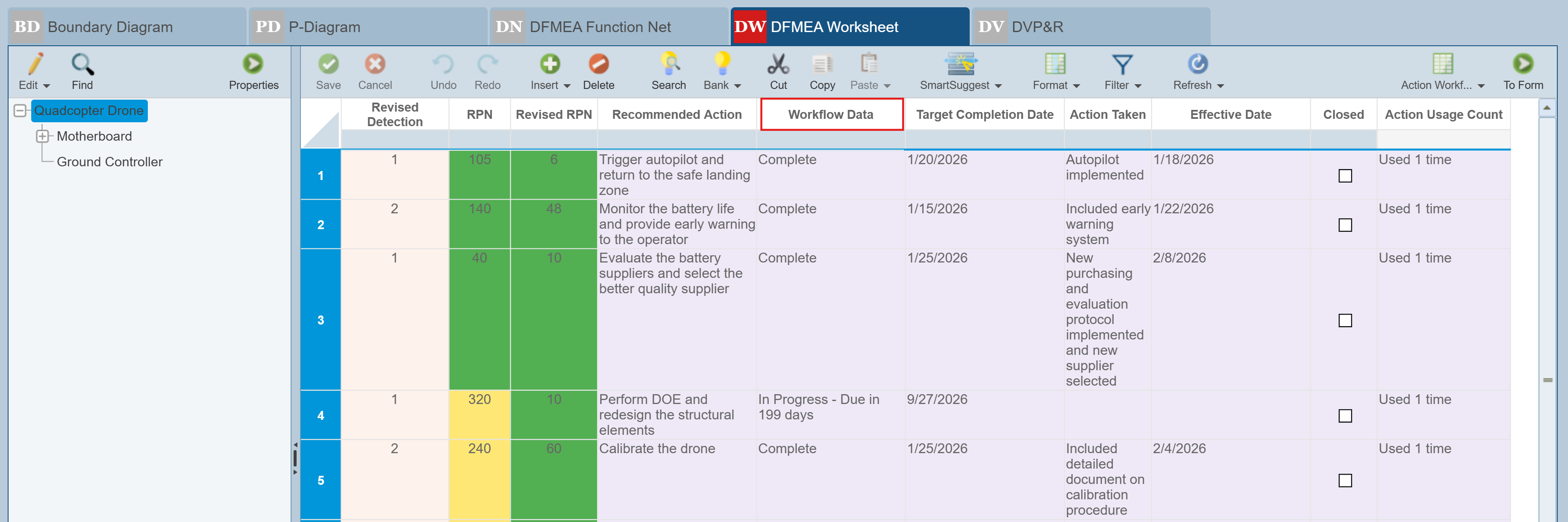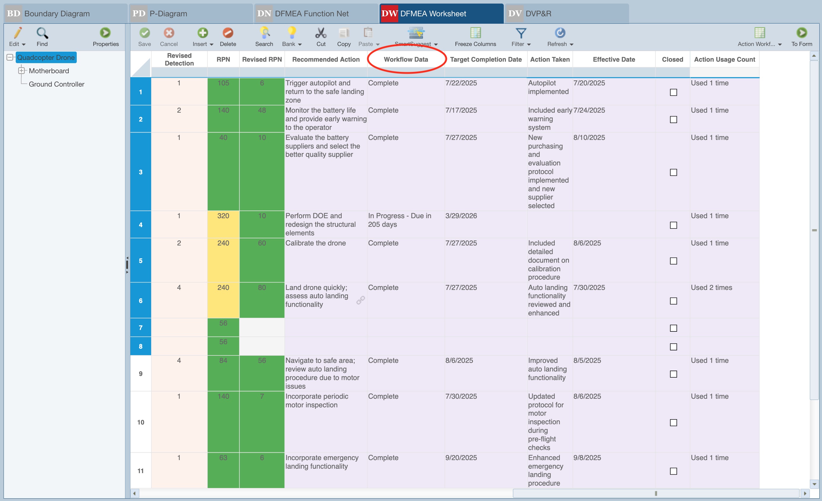 Review the DVP&R data for our Example Drone Analysis. Just as the FMEA Worksheet can be customized, the DVP&R worksheet can be customized as you prefer. See the Customizing the FMEA Worksheets topic for more information.