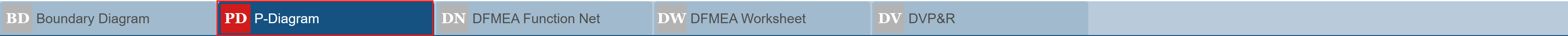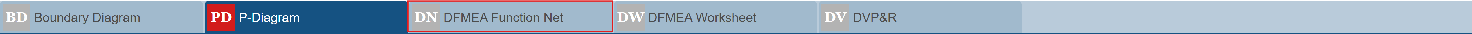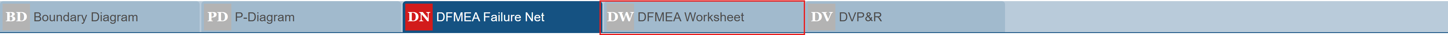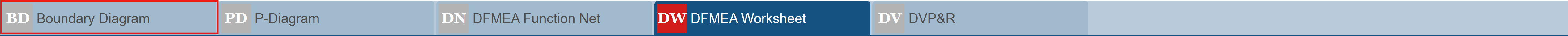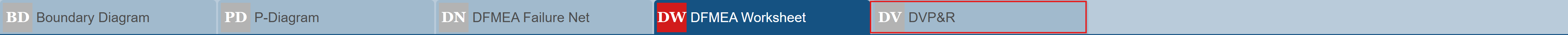 The main Design FMEA window has five tabs that include all the data related to the DFMEA process: the Boundary Diagram, the P-Diagram, the DFMEA Function Net, the DFMEA Worksheet, and the DVP&R worksheet.