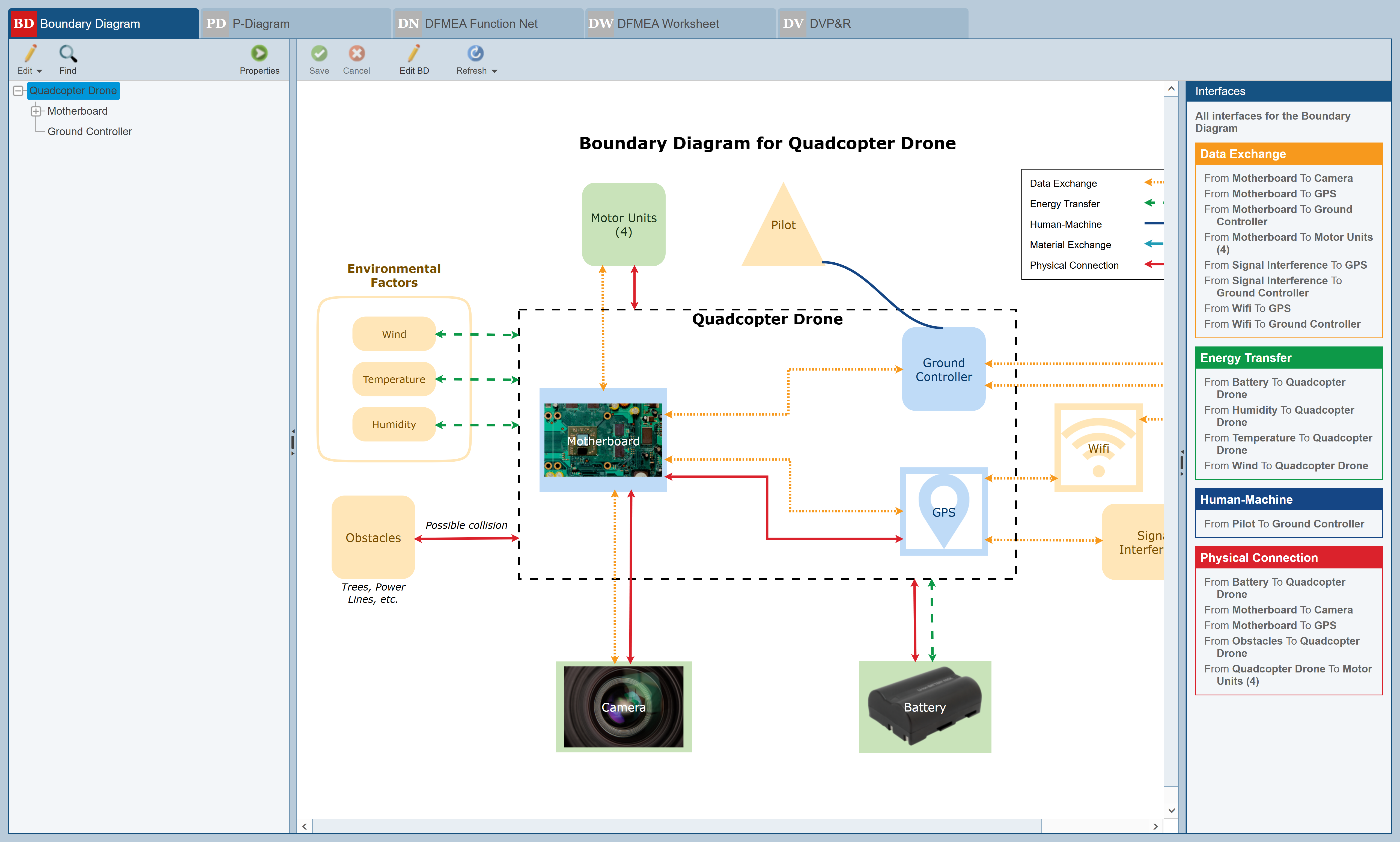 The Boundary Diagram worksheet displays the example Boundary Diagram for the Quadcopter Drone.