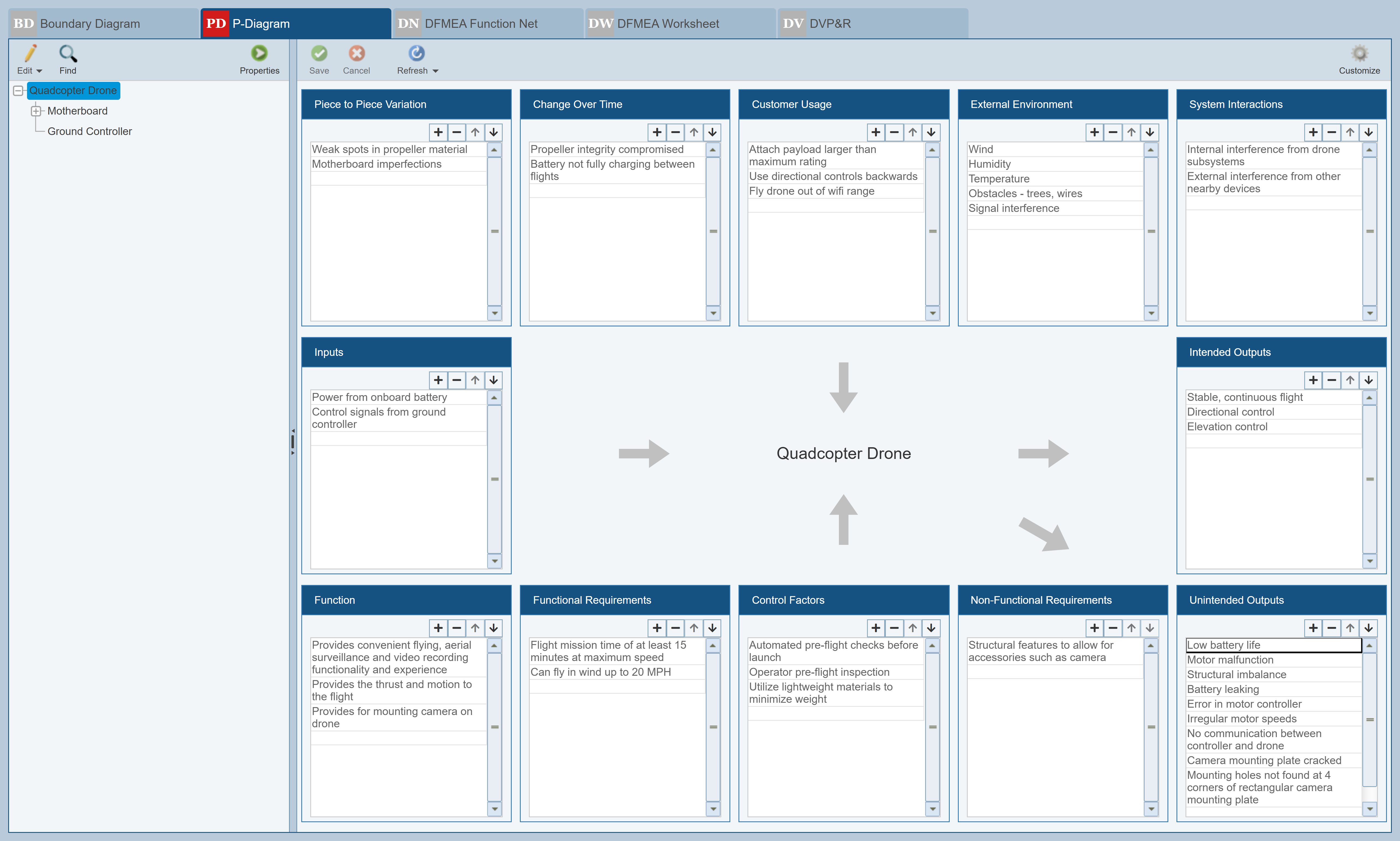 The P-Diagram worksheet displays the example P-Diagram analysis for the Quadcopter Drone.