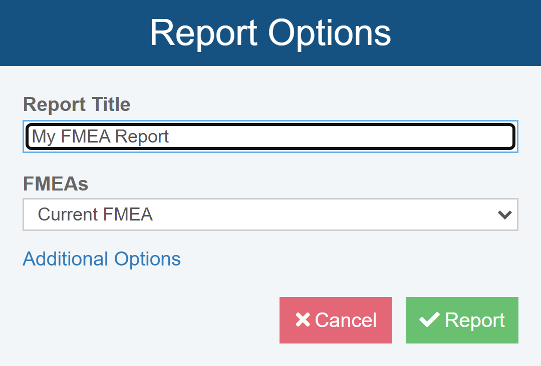 For more details about other features on the Additional Options dialog, see Generating FMEA Reports.