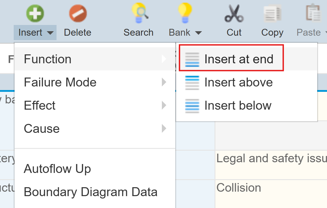 Relyence FMEA detects where you are in the DFMEA Worksheet and intelligently determines what to insert for you. You can always use the dropdown Insert functions from the toolbar to insert the appropriate FMEA item. However, you can click the Insert button at any point to insert items at the level you are on. Also note that on the DFMEA Worksheet, DVP&R Worksheet and other tables in Relyence FMEA, keyboard support for Insert is supported using the <Insert> key and <Ctrl>+<Shift>+<NumPad +>.