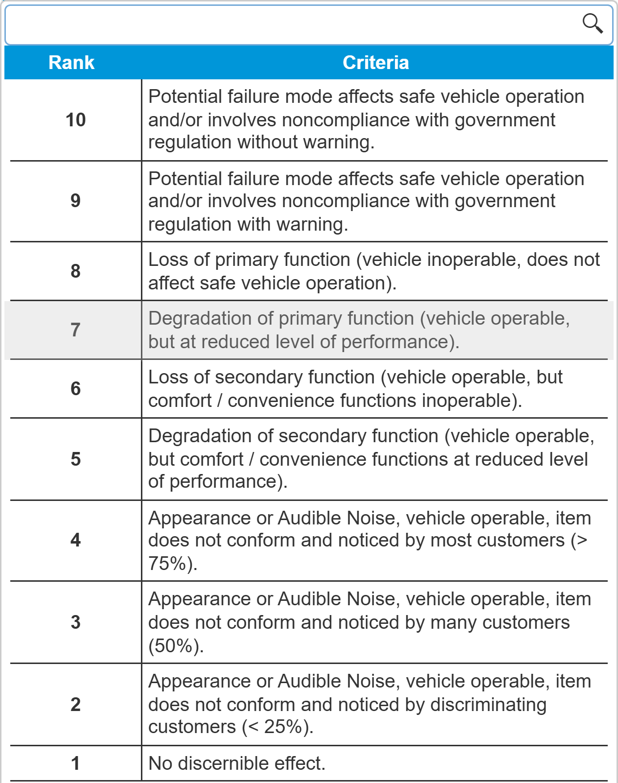 Effect Severity: 7. You can use the dropdown list or enter the value directly. Use the dropdown list to see the commonly used descriptions of Severity levels. Please note that these are the default Rank and Criteria used in the Relyence Example; these can be customized to your needs. If your list looks different than those shown below, your Risk Criteria have been customized. Notice that when you select the failure Effect Severity, the Failure Mode Severity is automatically filled in once you press the Tab key.