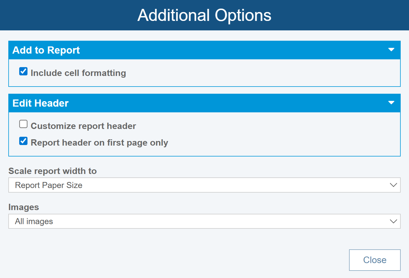 Click Close to save the Additional Options settings.