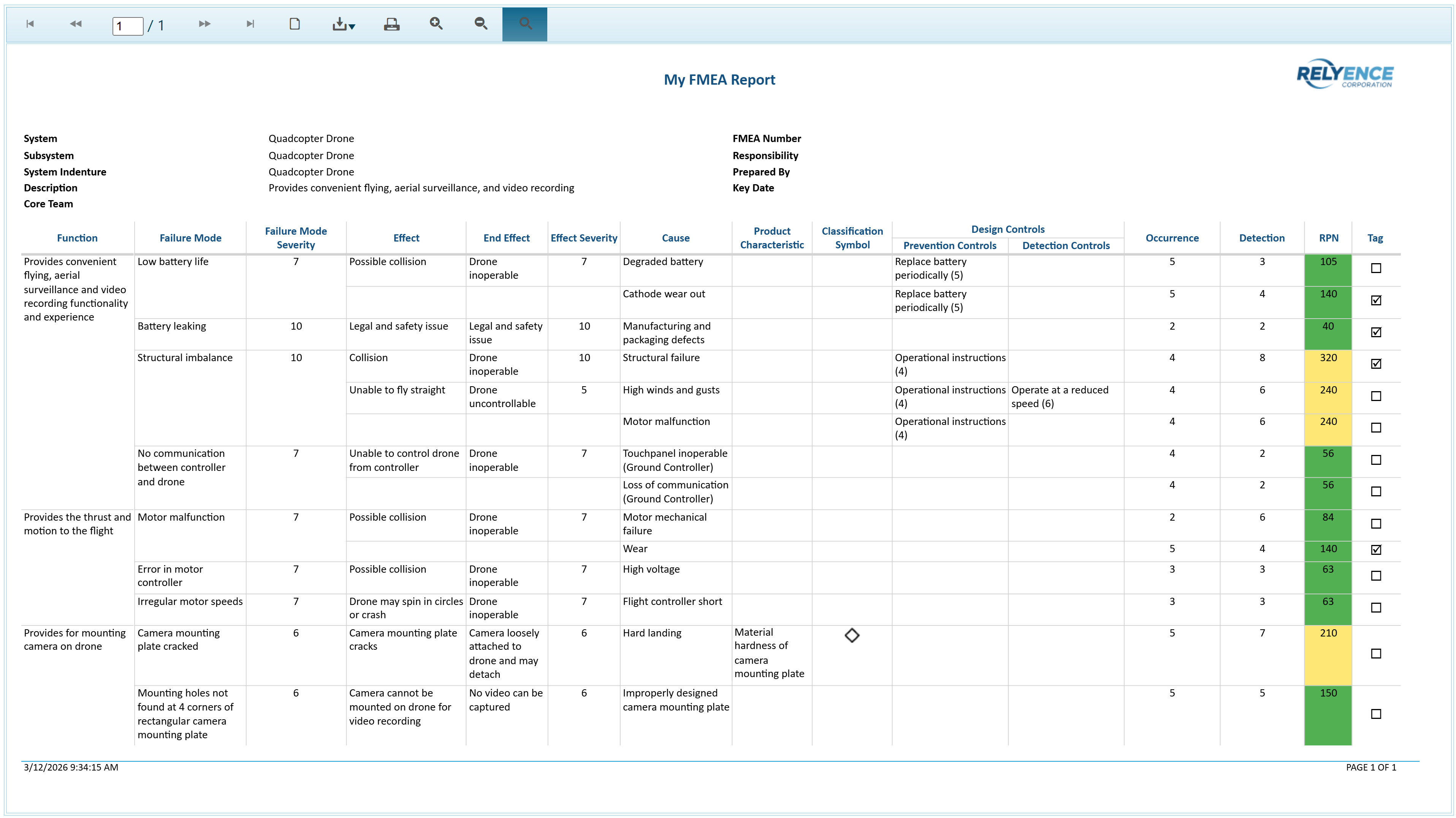 For this tutorial, we will use the Drone Example Design FMEA (DFMEA) supplied with Relyence FMEA. Relyence FMEA supports various other types of FMEAs; however, they will not be covered in this tutorial. For more information on other FMEA types, including Process FMEA (PFMEA), Piece-Part FMECAs, and Monitoring and System Response FMEAs (FMEA-MSR), please review the Types of FMEA topic of this guide.