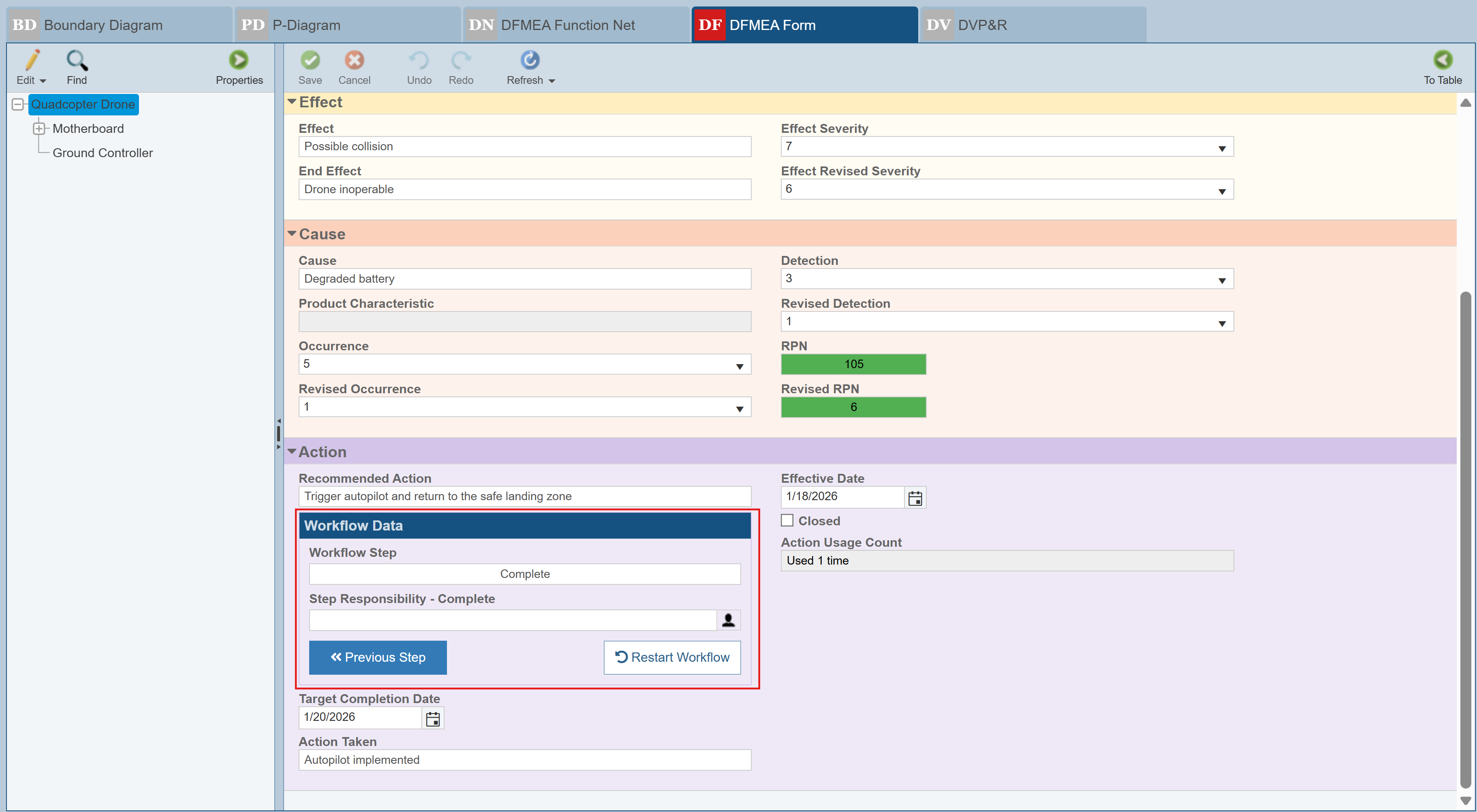 Relyence FMEA optionally can incorporate a FMEA Workflow process, including Approvals and Notifications. This enables you to control your FMEA process, keep your team informed of assignments, and track progress. The FMEA Workflow, Approvals, and Notifications are all completely customizable. The Example Drone Analysis contains a simple Workflow sample. To view the details about the Workflow, click on the Workflow Data control.