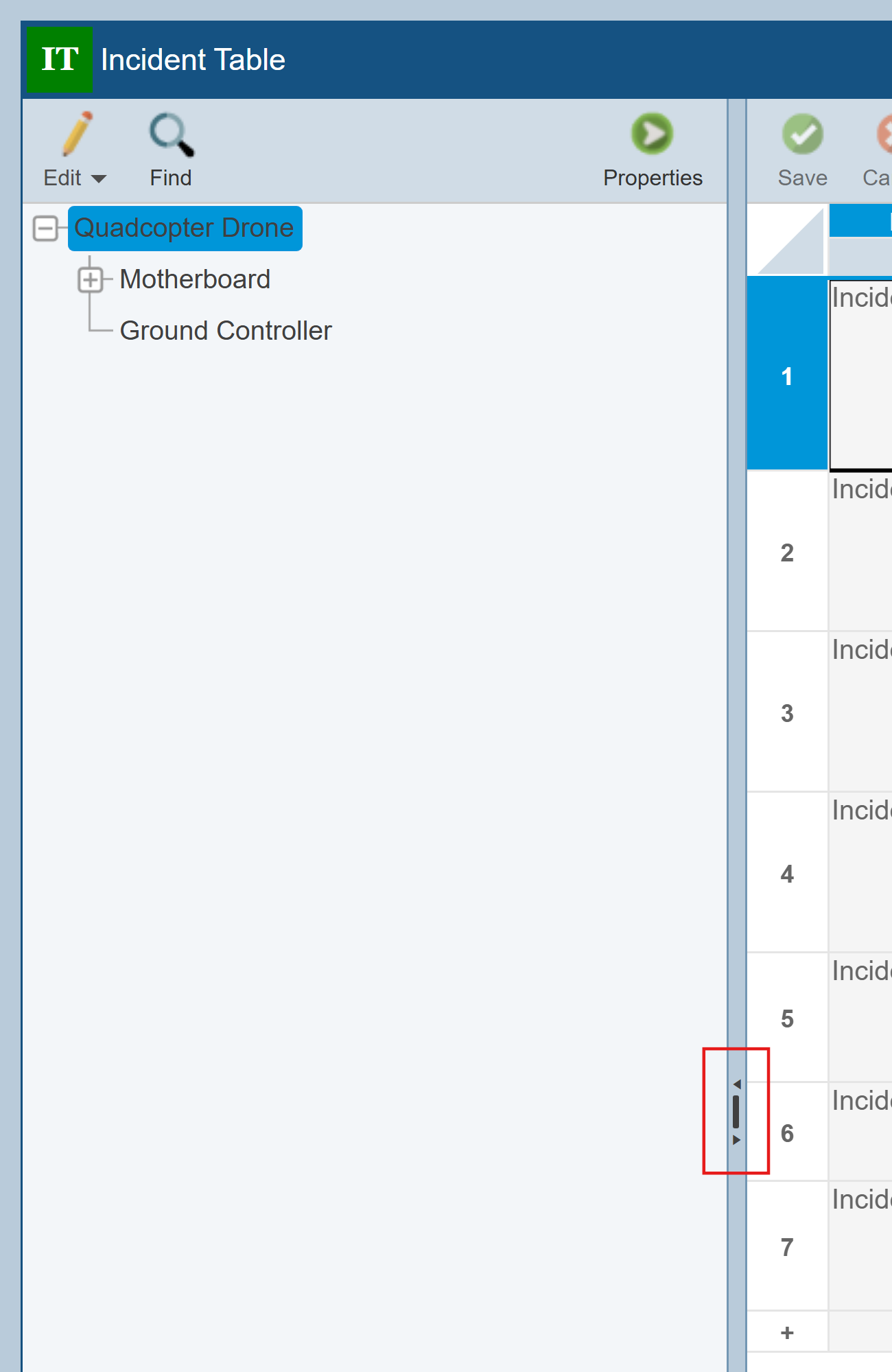 Make sure that the Quadcopter Drone is selected in the Analysis Tree. Go to the empty row at the bottom of the Incident Table.