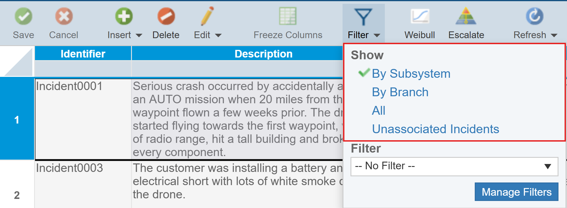 The Incident Table displays a list of all the Incidents logged to date associated with the item selected in the Analysis Tree. In this case, the Incidents associated with the Quadcopter Drone are displayed.