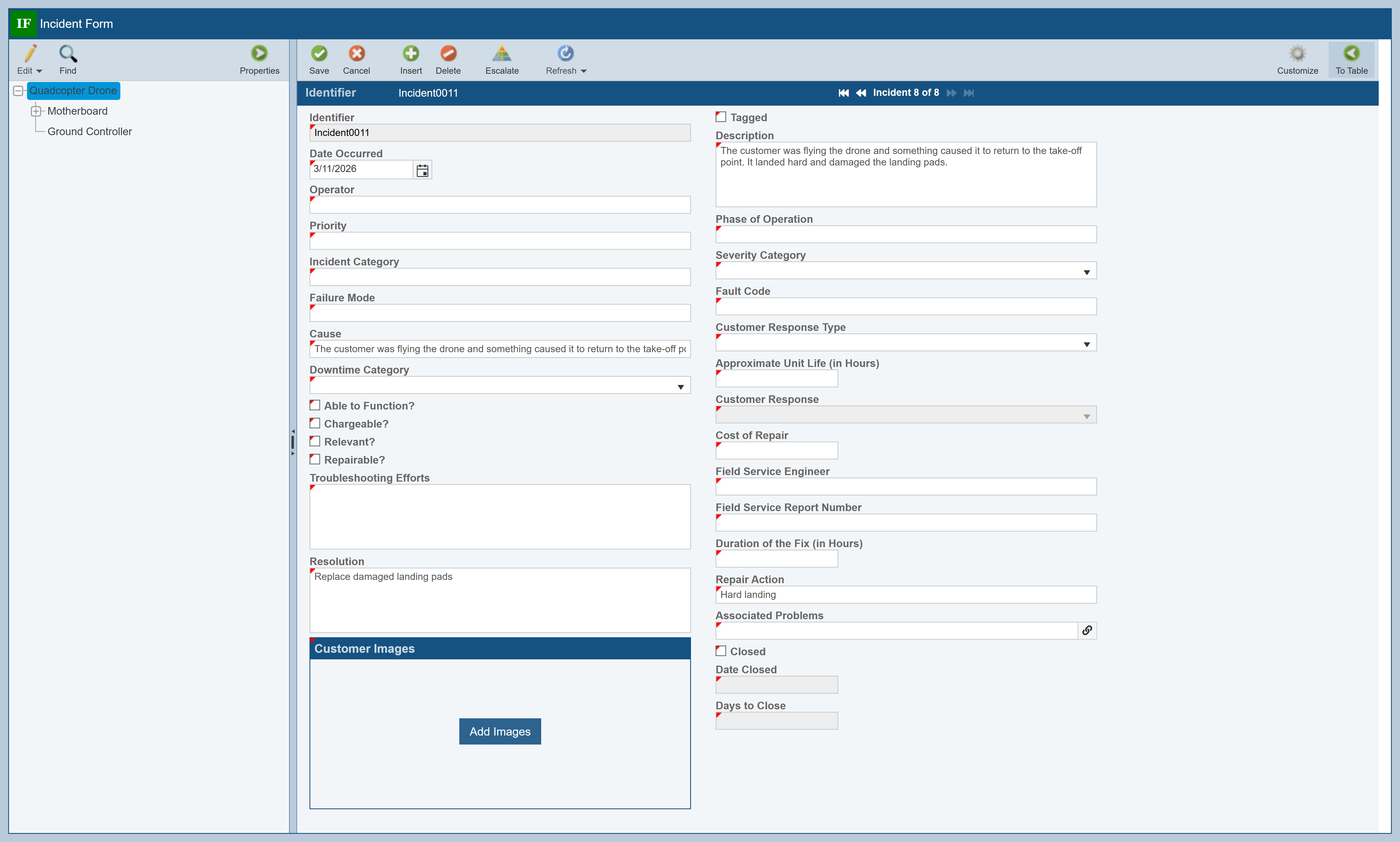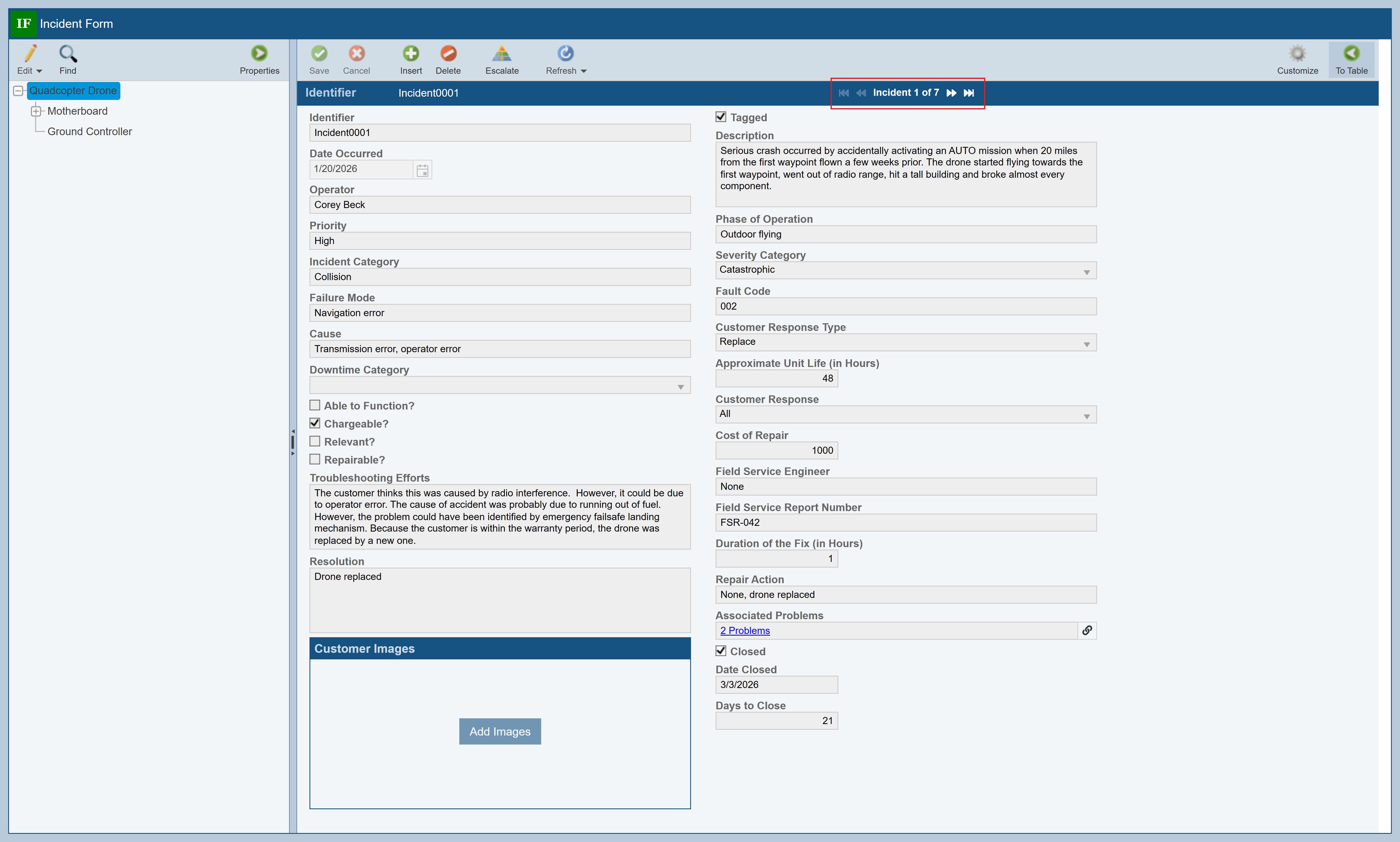 To review more details about a particular Incident, you go to the Incident Form. Make sure Incident001 in the Quadcopter Drone is selected in the Incident Table, and then click the To Form button in the toolbar.