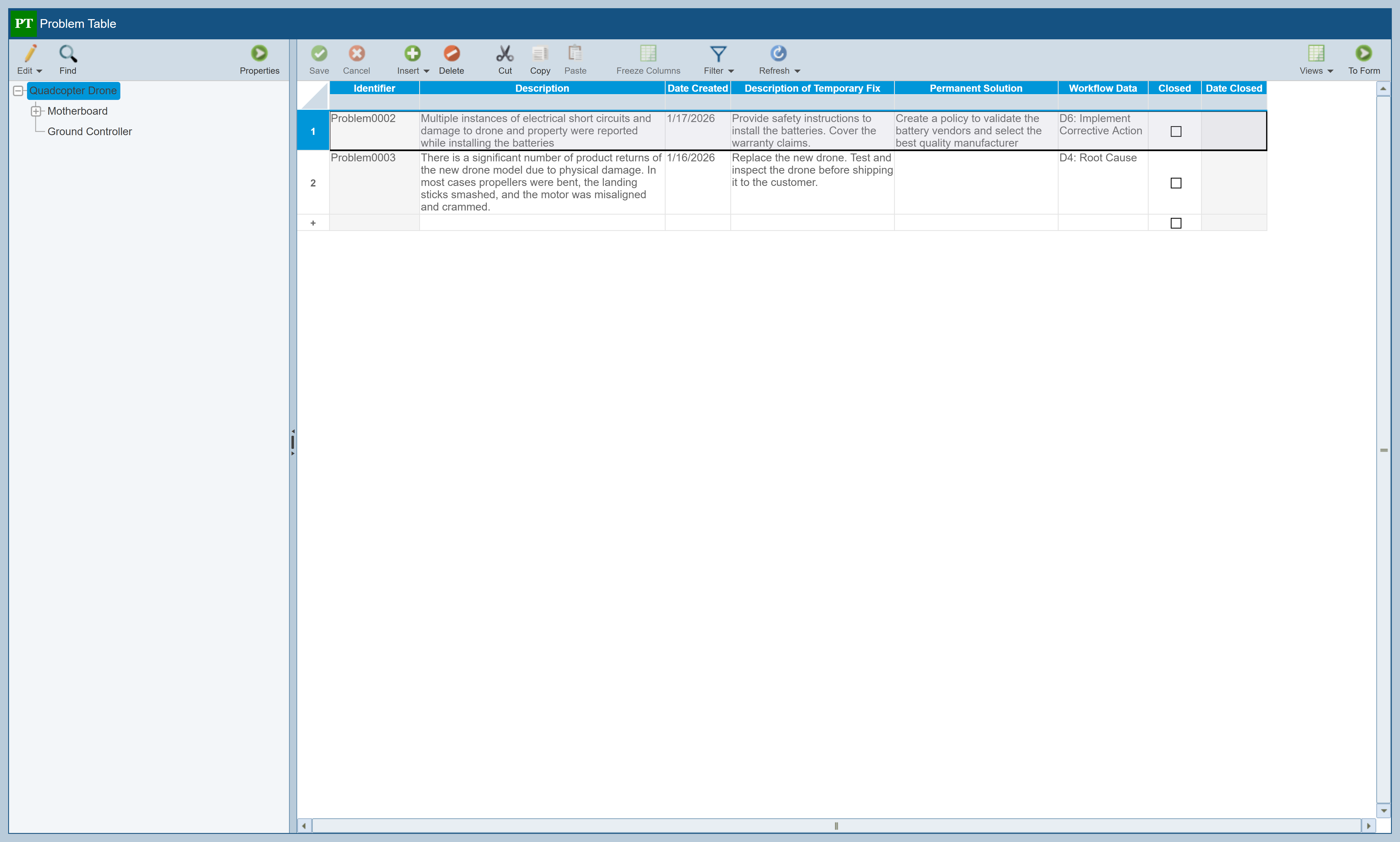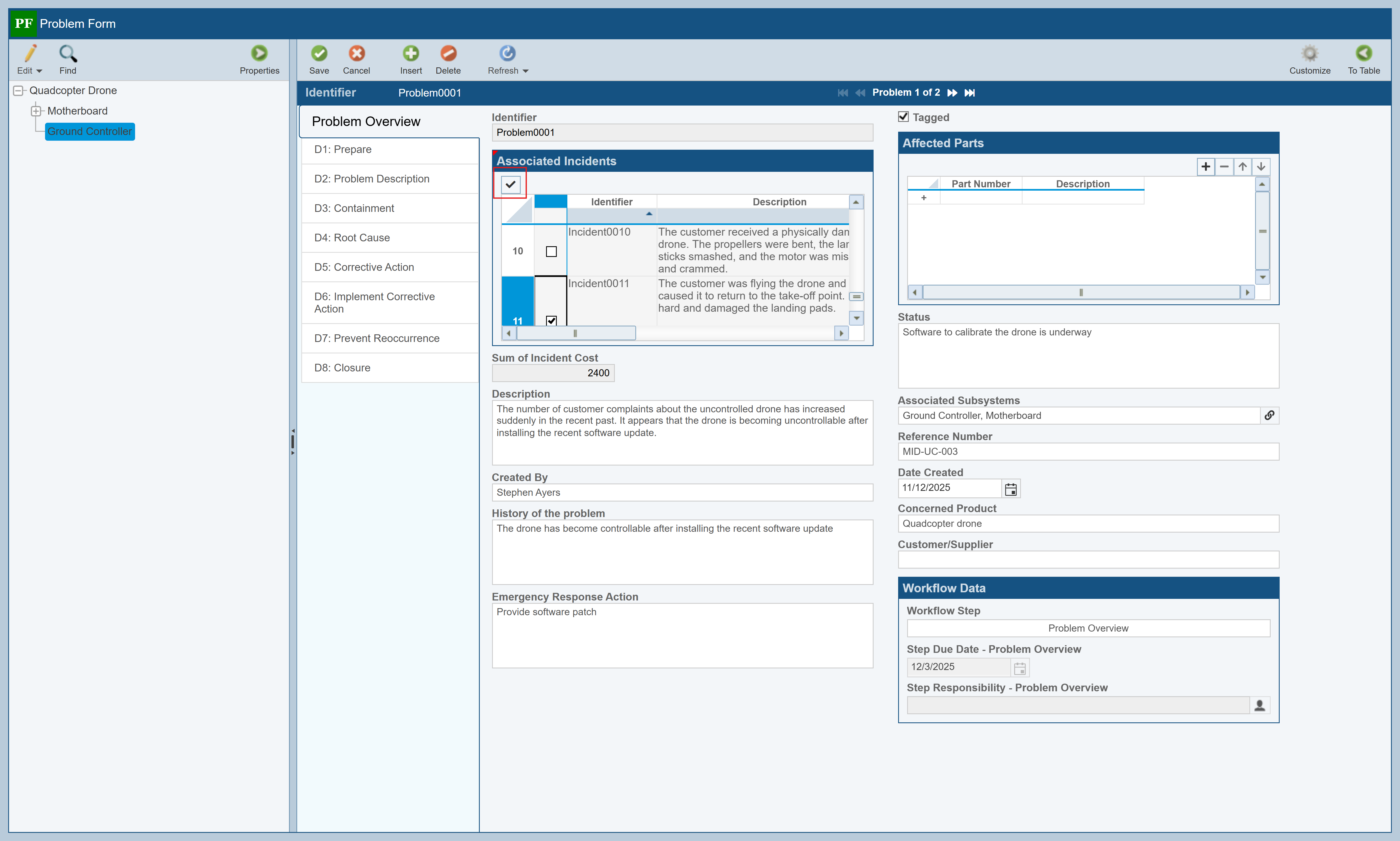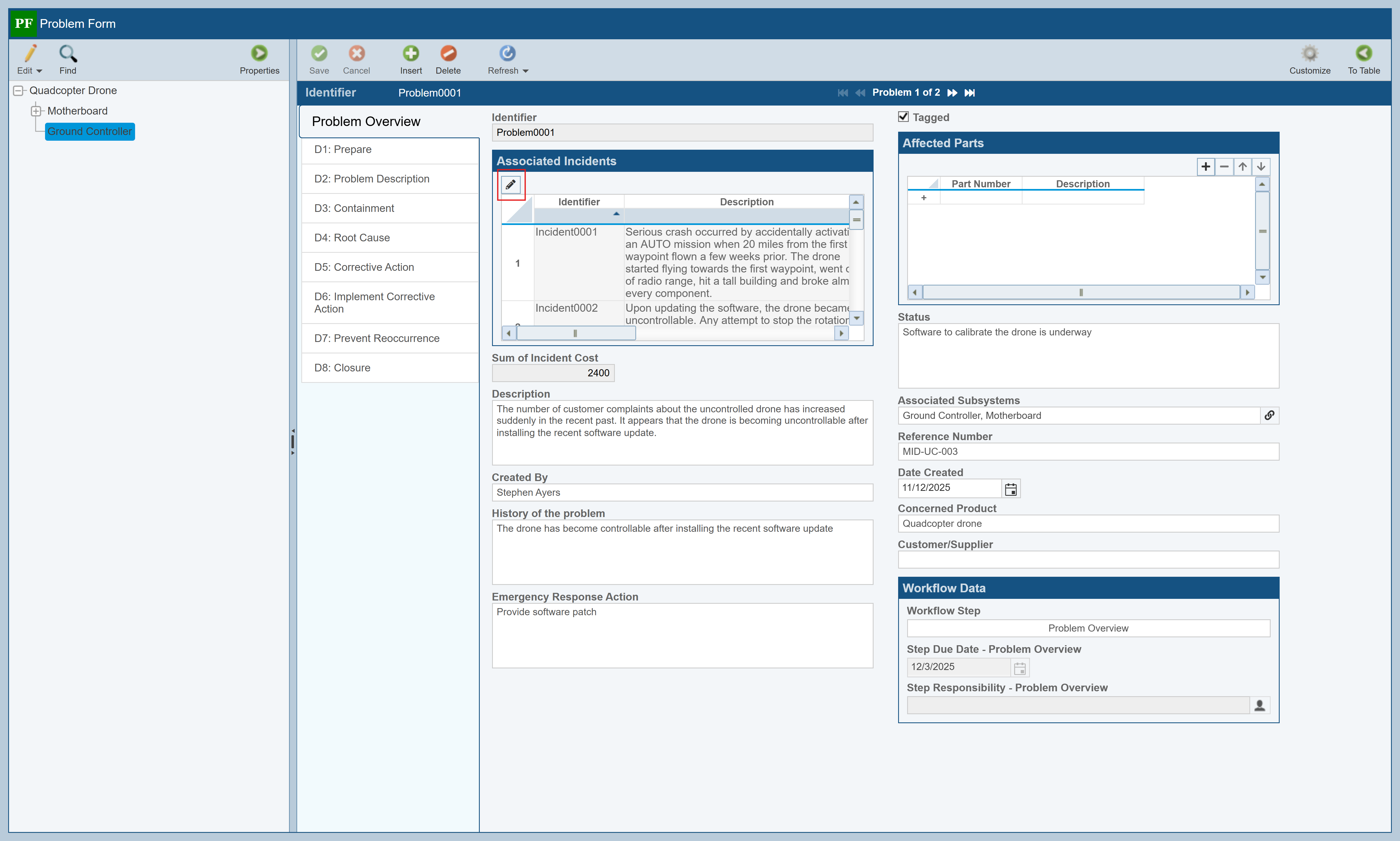 Now, let's move to the Problem Table and see if this new Incident should be grouped in with a Problem already created. Click Problems in the Sidebar to display the list of Problems associated with the Drone. This new incident does not appear to be similar to the Problems listed. Click on Ground Controller in the Analysis Tree. Notice that Problem0001 refers to an uncontrolled drone, similar to what was reported in the new Incident. This suggests we should associate the new Incident to Problem001 so duplicate effort does not occur for corrective action.